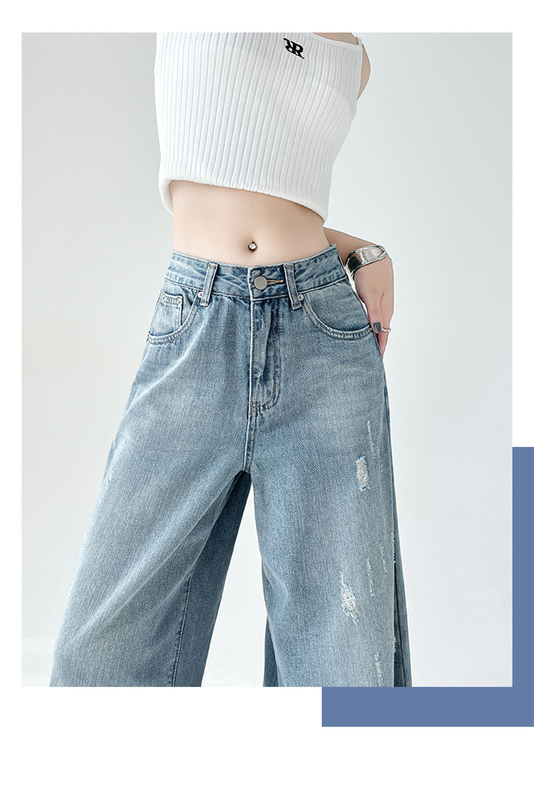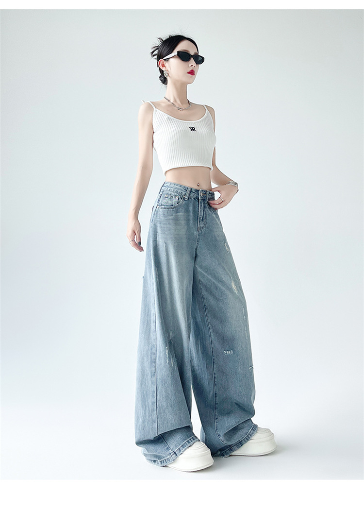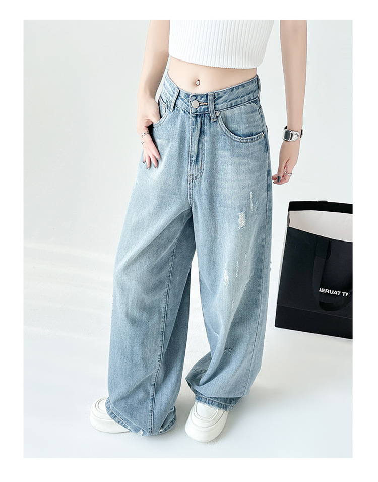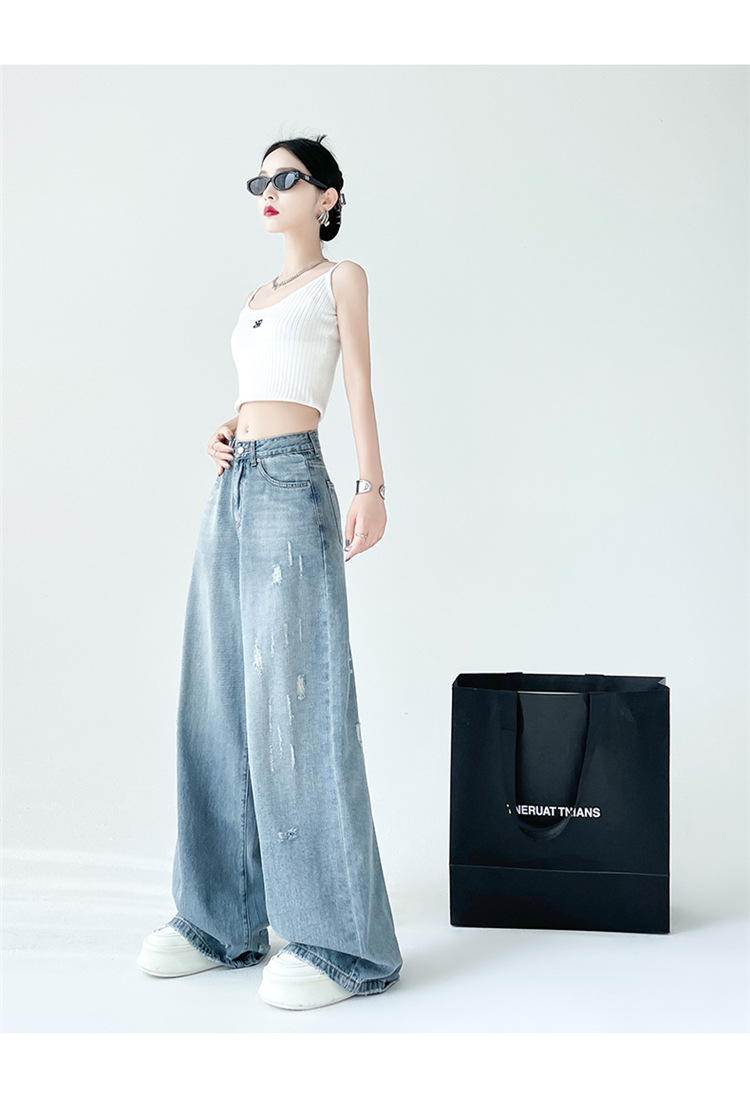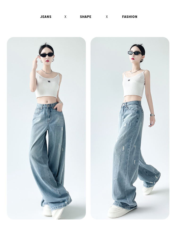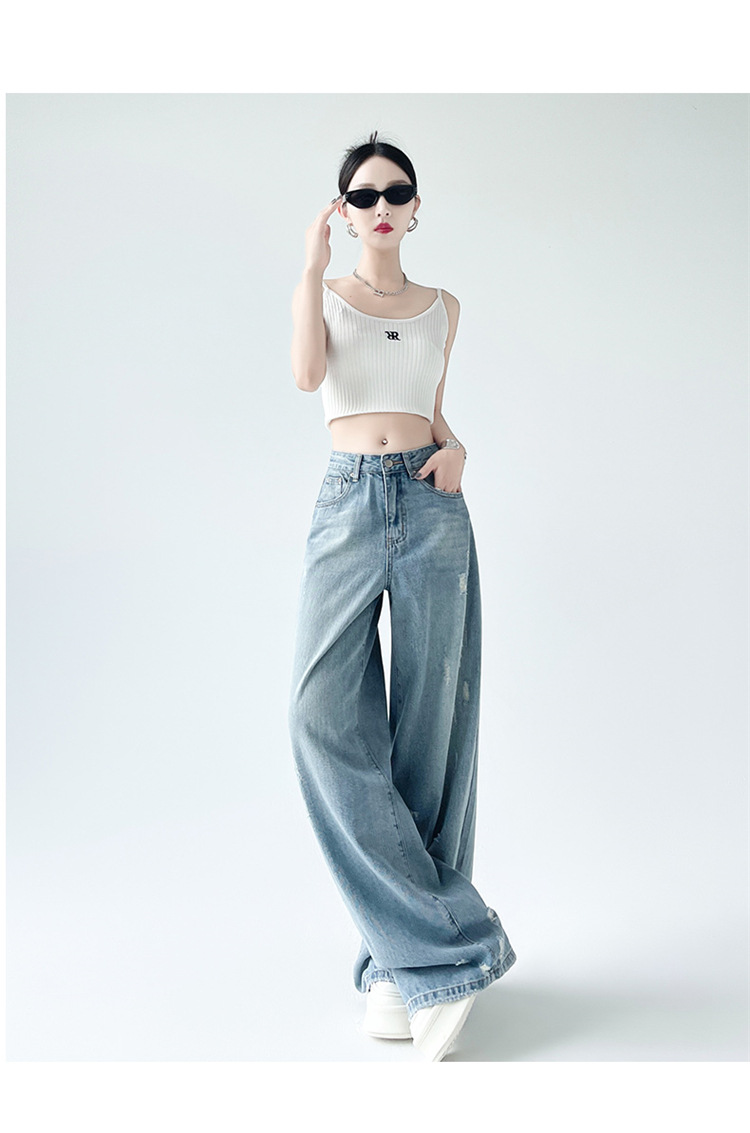 [진음] 레트로 세척 스크래치 청바지 여성용 느슨한 높은 허리 슬리밍 스트레이트 레그 와이드 레그 팬츠스토어 가기