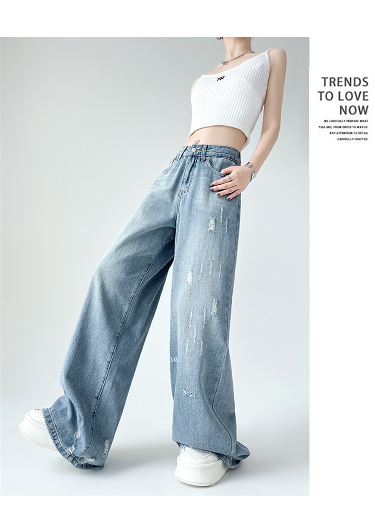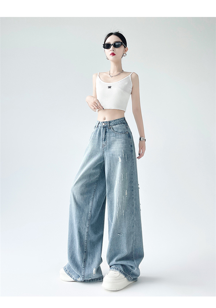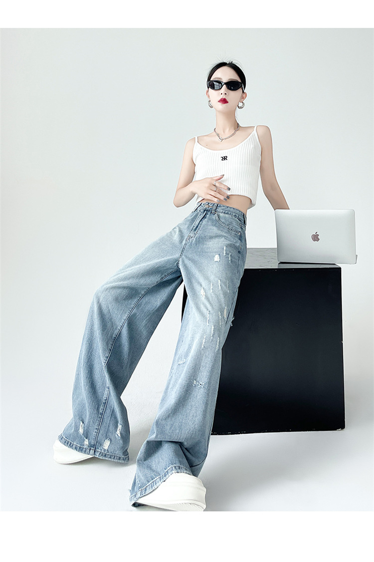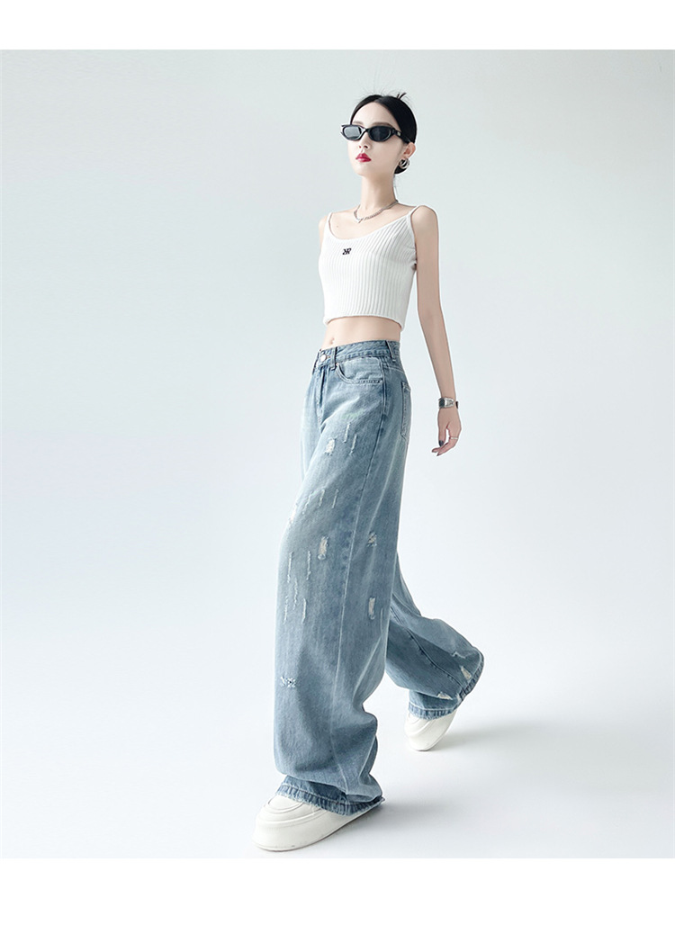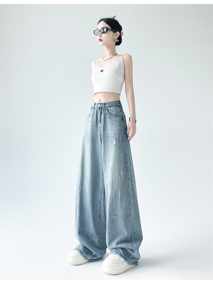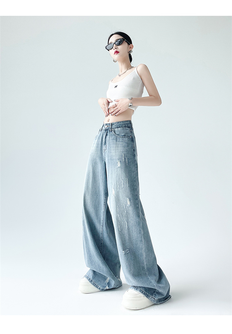 [진음] 레트로 세척 스크래치 청바지 여성용 느슨한 높은 허리 슬리밍 스트레이트 레그 와이드 레그 팬츠스토어 가기