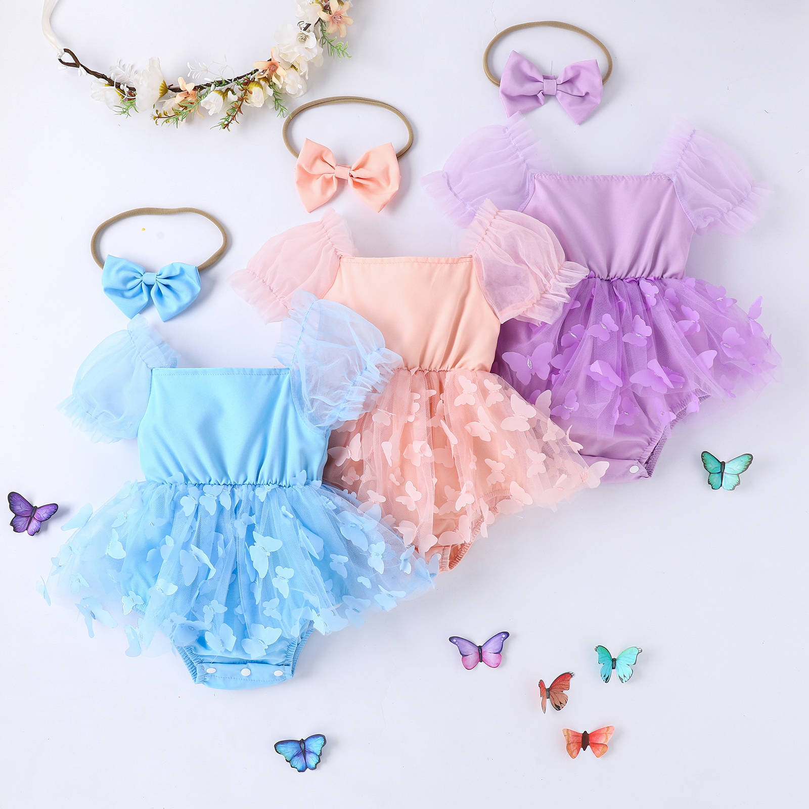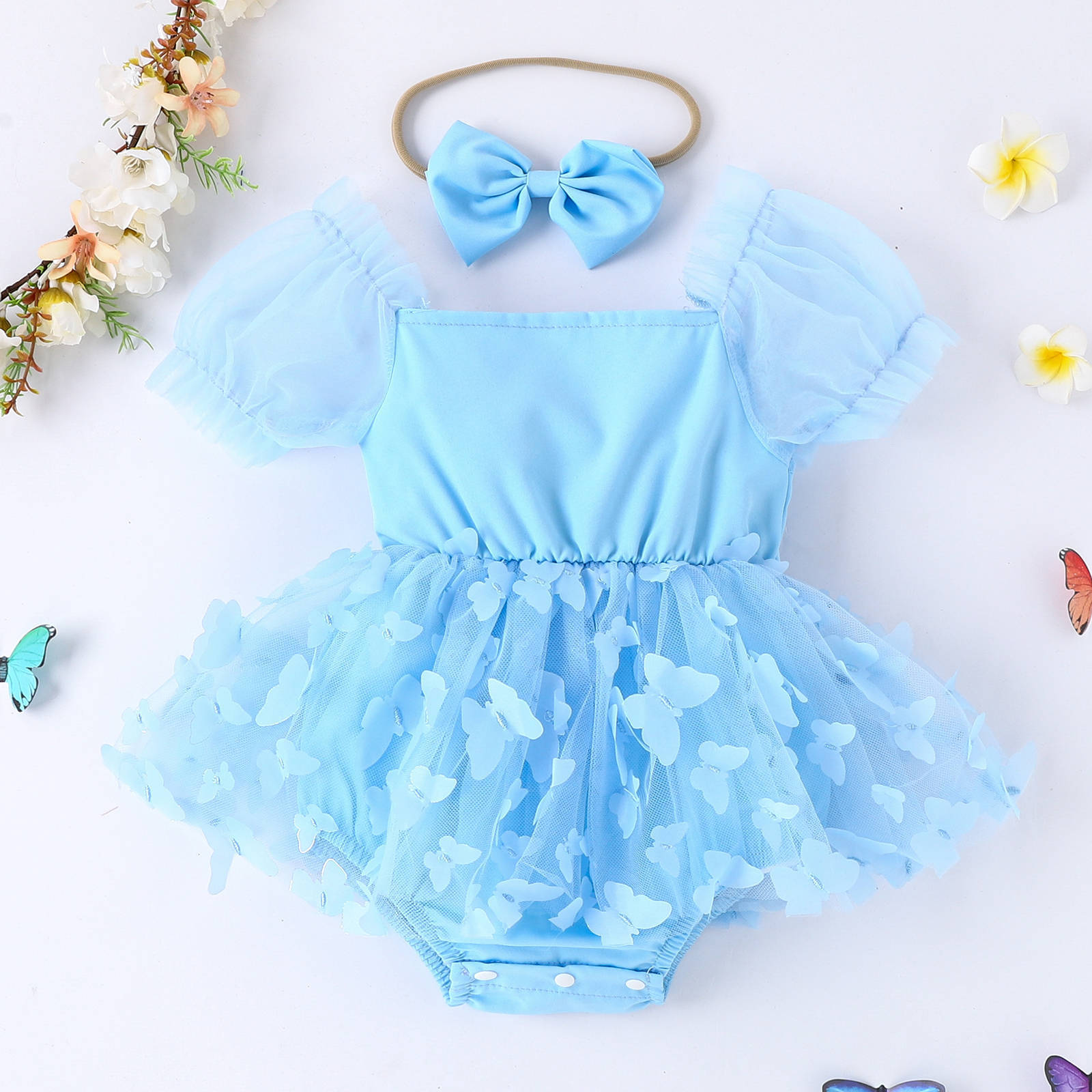 대외 무역 아마존, 새로운 폭발 소녀 점프 수트 메쉬 짧은 소매 입체 나비 거즈 스커트를 열 수 있습니다