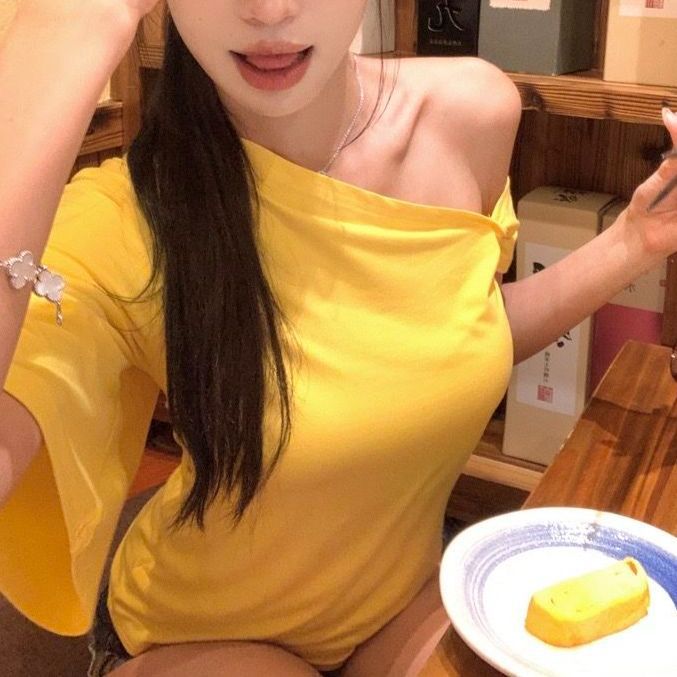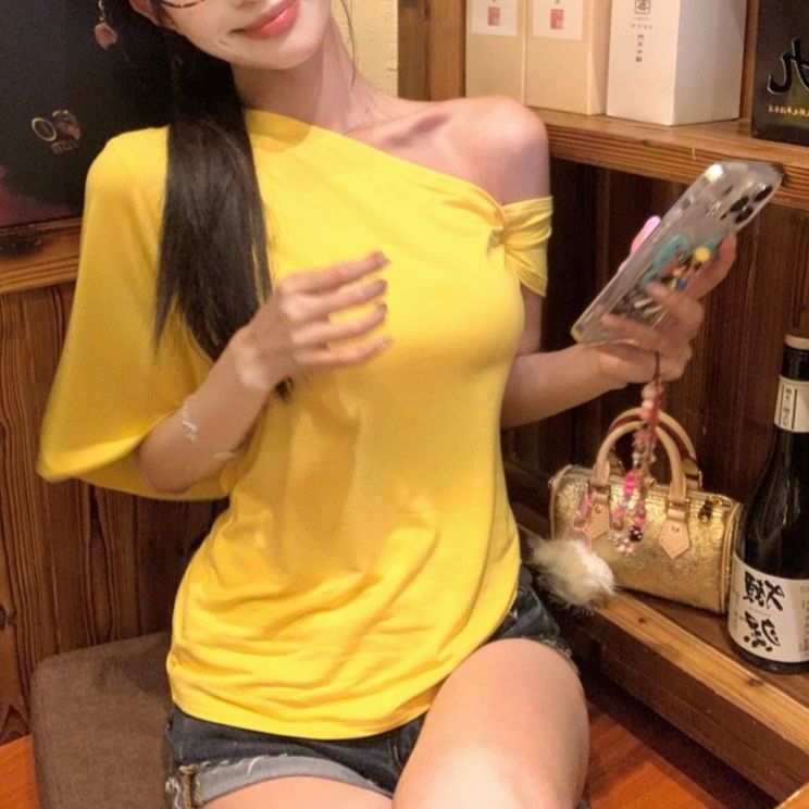 재고! 순수한 욕망 노란색 티셔츠 여성의 여름 새로운 디자인 감각 틈새 불규칙한 오프 숄더 짧은 우아한 탑스토어 가기