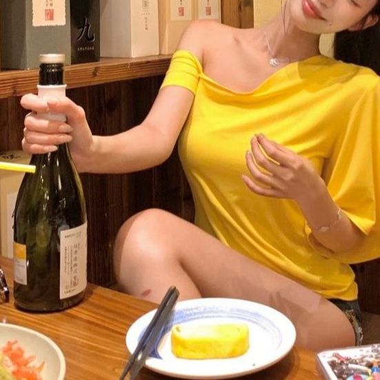 재고! 순수한 욕망 노란색 티셔츠 여성의 여름 새로운 디자인 감각 틈새 불규칙한 오프 숄더 짧은 우아한 탑