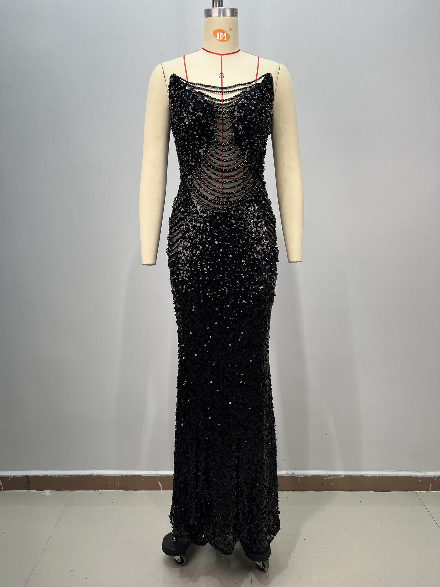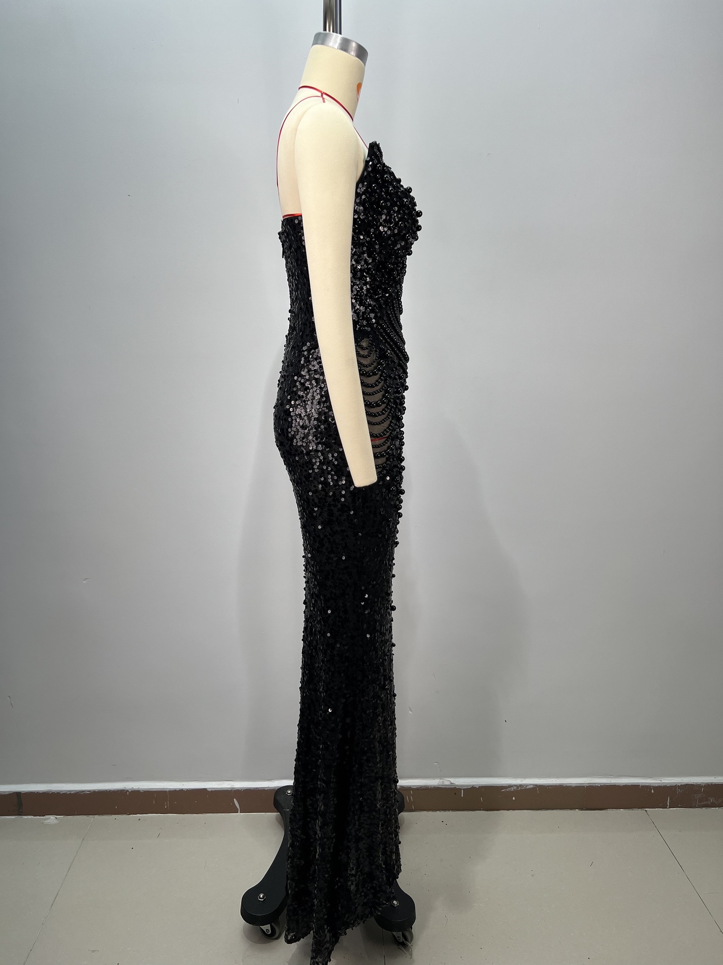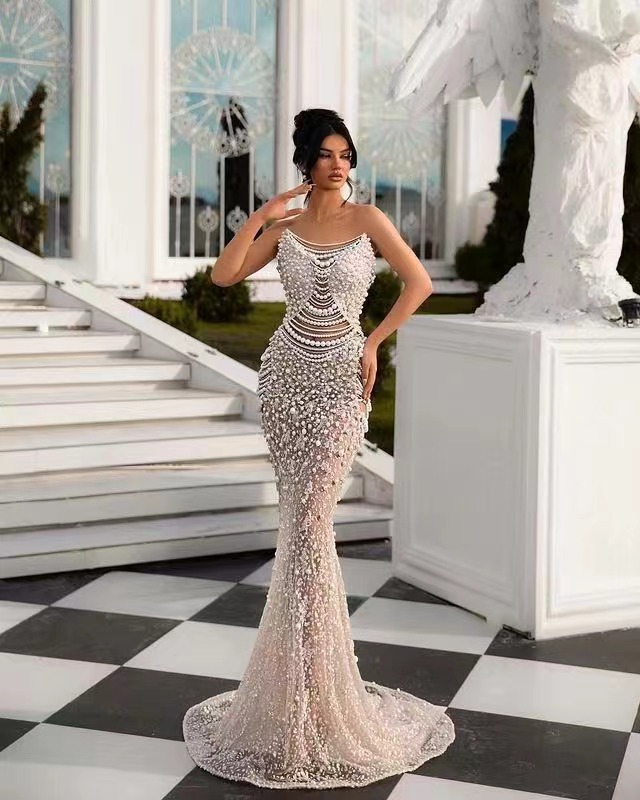알리익스프레스 특가 블랙 앤 화이트 진주 시리즈 딥 V넥 시스루 메쉬 하이웨이스트 슬리밍 무대/연회용 드레스