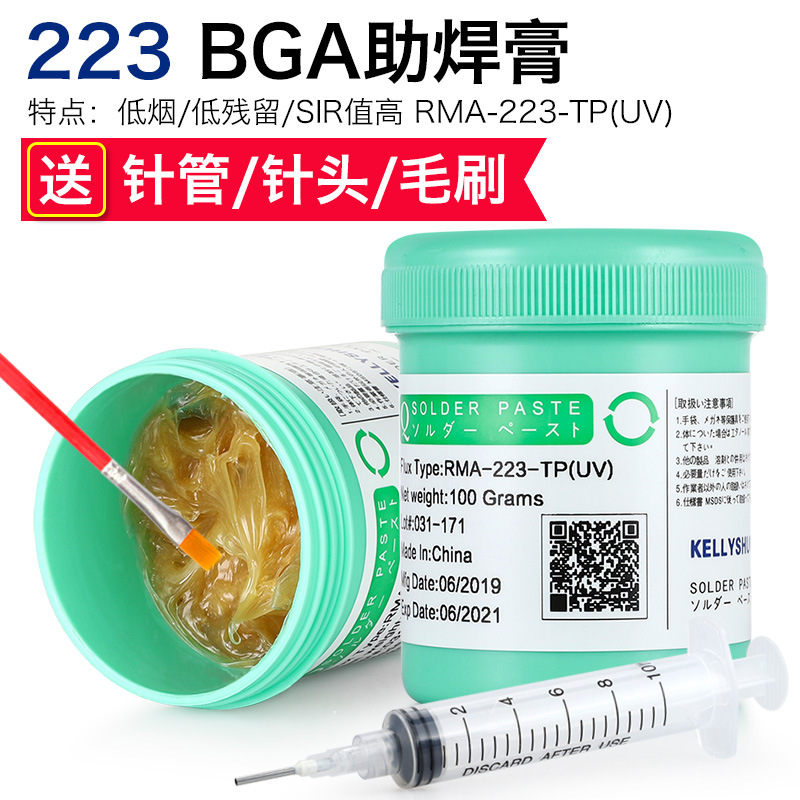 • RMA223TP-UV 솔더 페이스트 100g에는 브러시 + 바늘 튜브가 함께 제공됩니다.