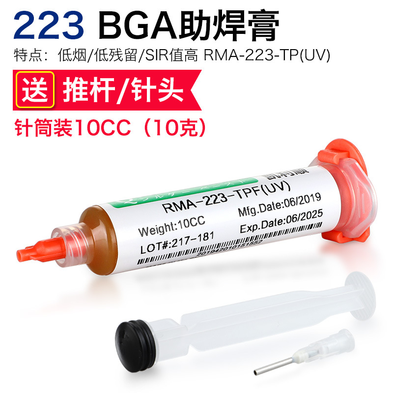 • RMA223TP-UV 주사기 플럭스 페이스트 10g에는 주사기가 함께 제공됩니다.