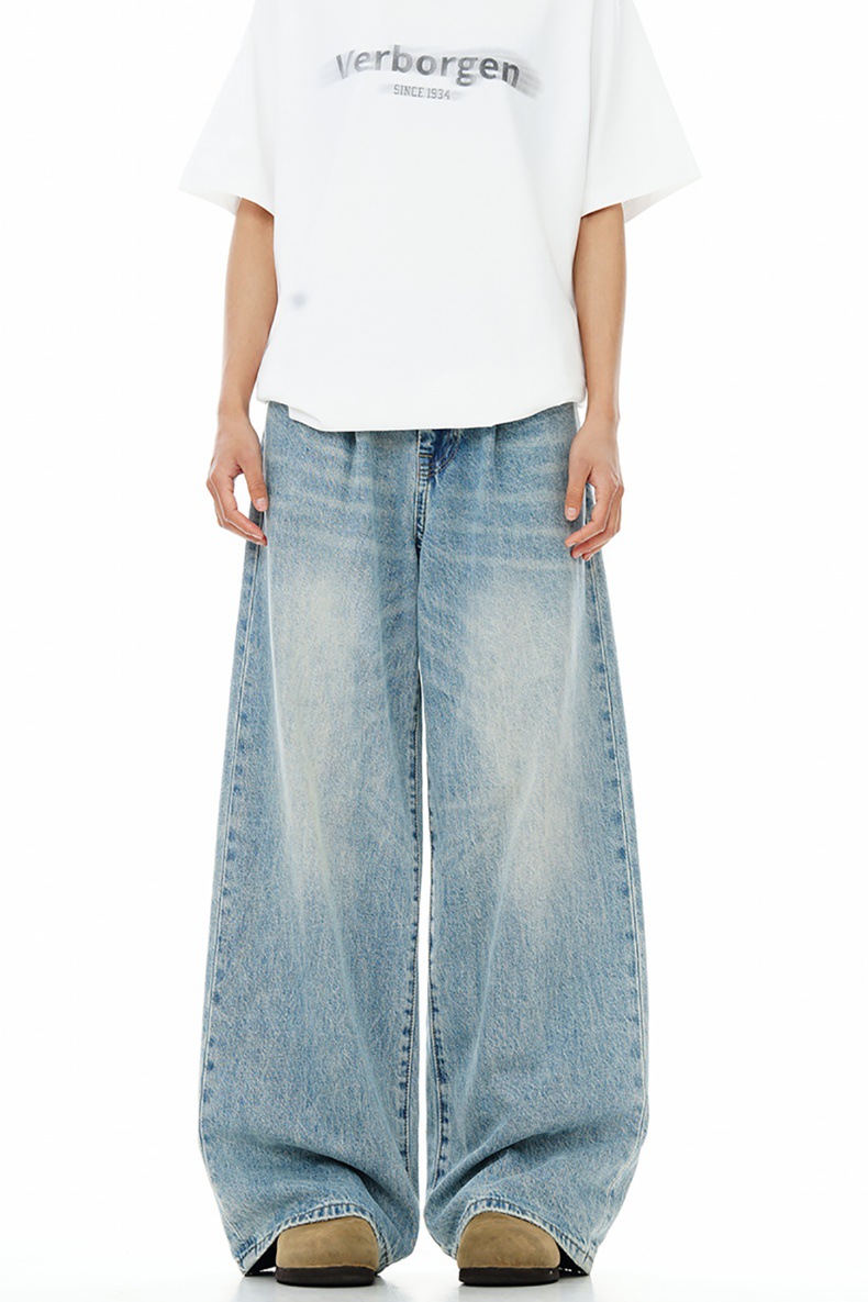Verborgen 라이트 블루 청바지 빈티지 오래 된 스트레이트 느슨한 넓은 다리 미국 스타일 하이 스트리트 남성 바지스토어 가기