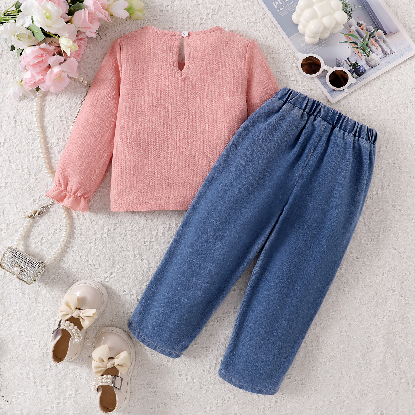 국경 간 아동복 아마존 유럽과 미국의 가을 및 겨울 활 레이스 긴 소매 최고 데님 바지 소녀 투피스 세트스토어 가기