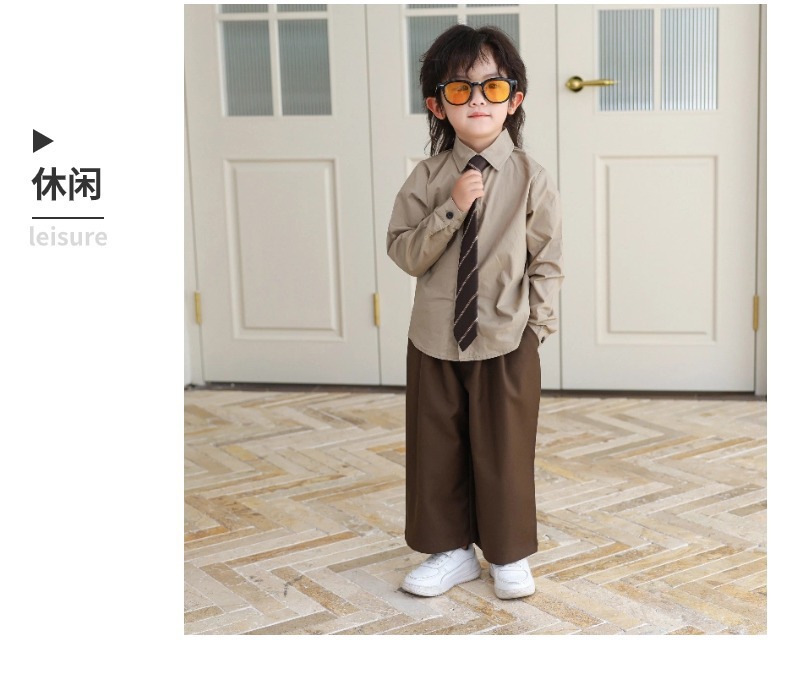 • 카키스 긴 소매 3 조각 세트 (카키스 긴 소매 다크 브라운 바지 다크 브라운 줄무늬 넥타이)