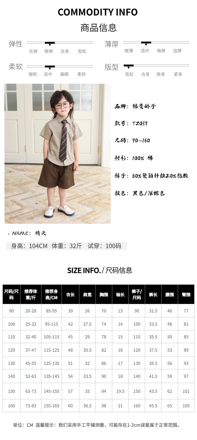 • 카키 반팔 3 피스 세트 (카키 반소매 다크 브라운 반바지 다크 브라운 줄무늬 넥타이)