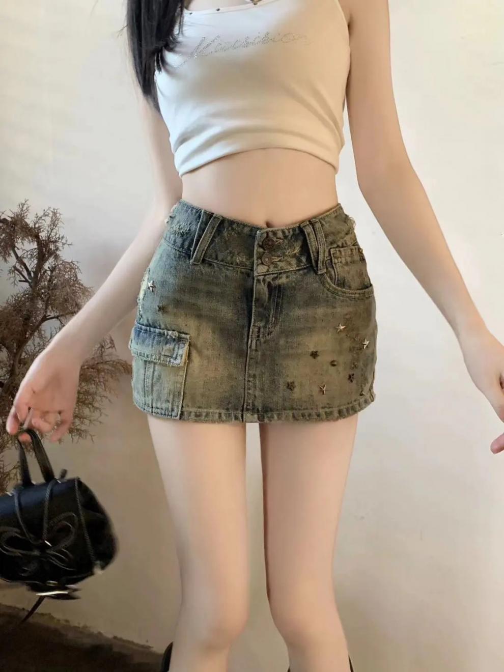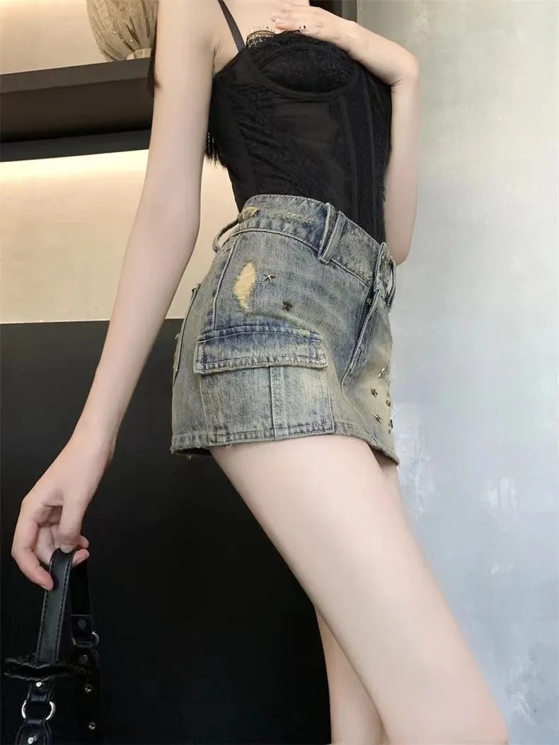 빈티지 높은 허리 세척 데님 스커트 여성의 2024 새로운 핫 라인 스톤 안티 러닝 핫 걸 엉덩이 A 자형 스커트