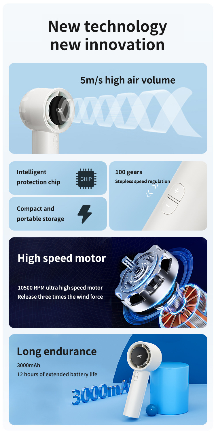 100 속도 무한히 가변 속도 고속 팬 최대 풍속 7 M/S 최대 전력 6W 배터리 용량 3000mah스토어 가기
