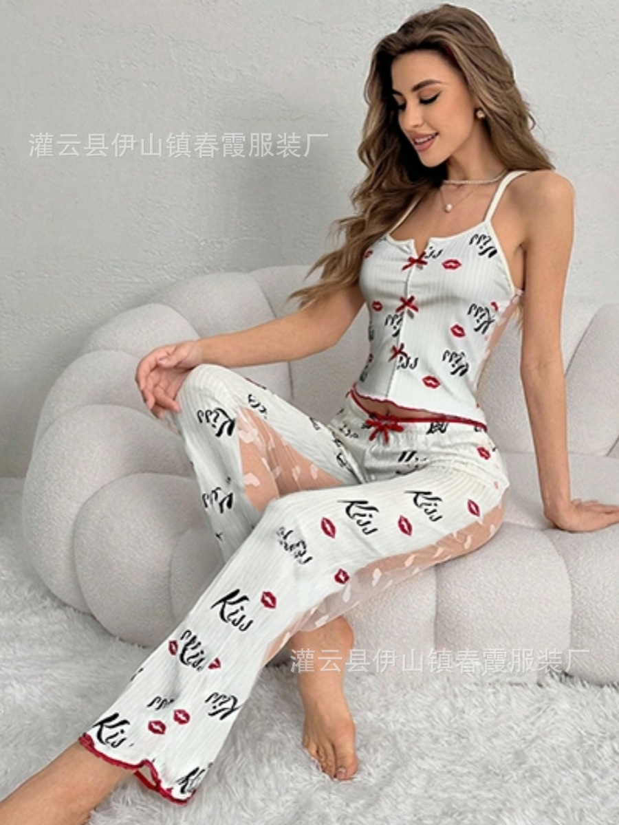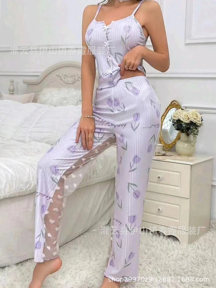 국경 간 Amazon 유럽과 미국의 새로운 섹시한 메쉬 스플 라이스 프린트 잠옷 여성용 투피스 세트 여성용 홈웨어스토어 가기