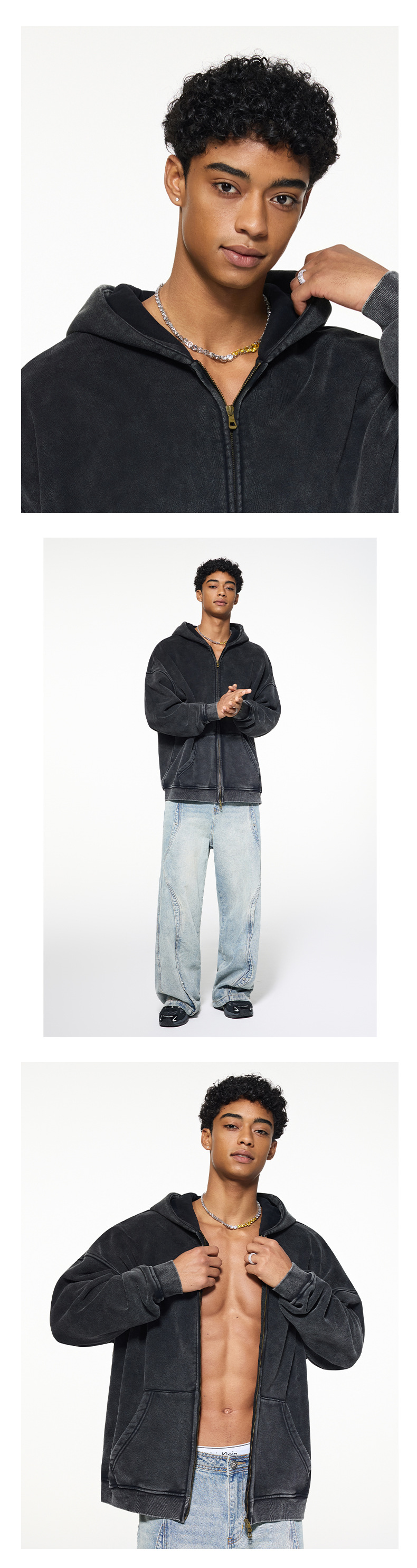 BK 남성용 360g 워싱 디스트레스드 아메리칸 스타일 지퍼 스웨트셔츠 남성용 솔리드 컬러 재킷 가을, 겨울 벨벳 두꺼운 후드 스웨트셔츠