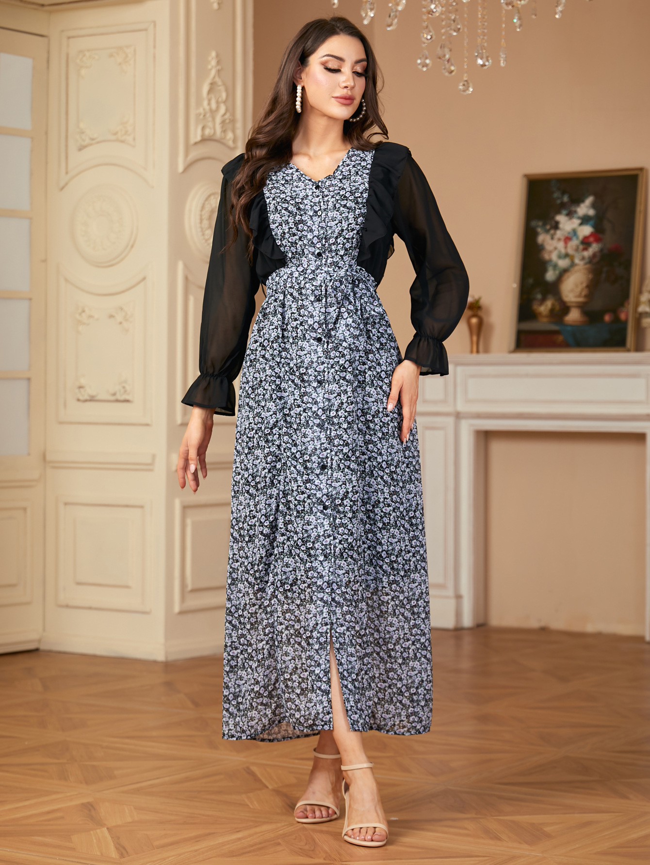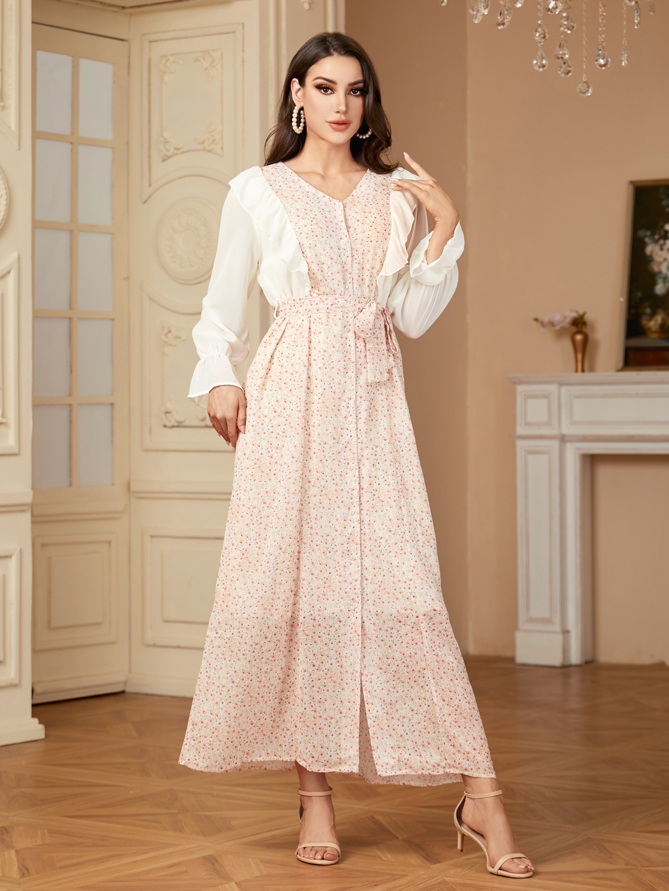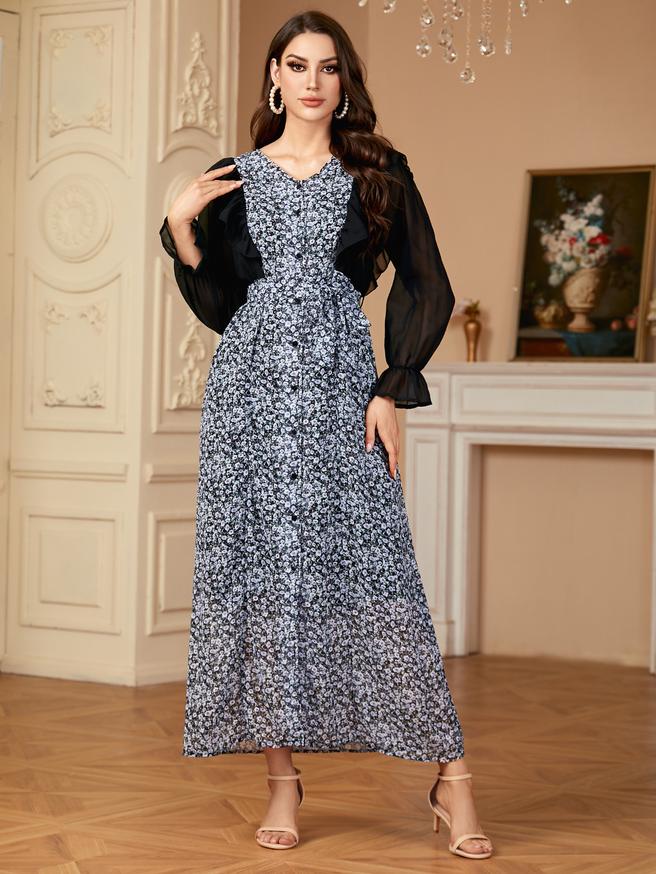 A1505 국경 중동 유럽과 미국 두바이 여성의 우아한 시폰 인쇄 카디건 원피스 원피스스토어 가기