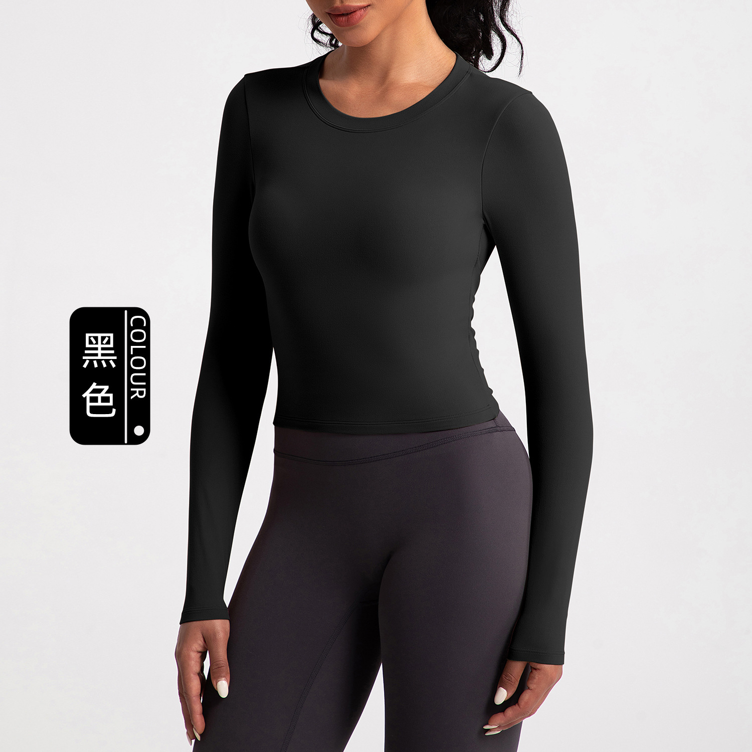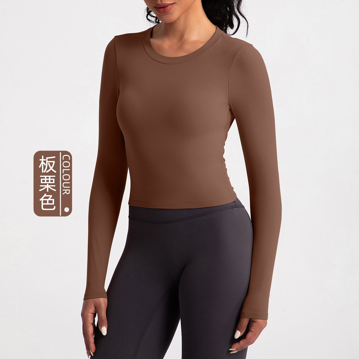 유럽과 미국의 새로운 스타일 요가 의류 여성용 긴 소매 벗은 꽉 달리는 스포츠 티셔츠, 가슴 패드 피트니스 탑