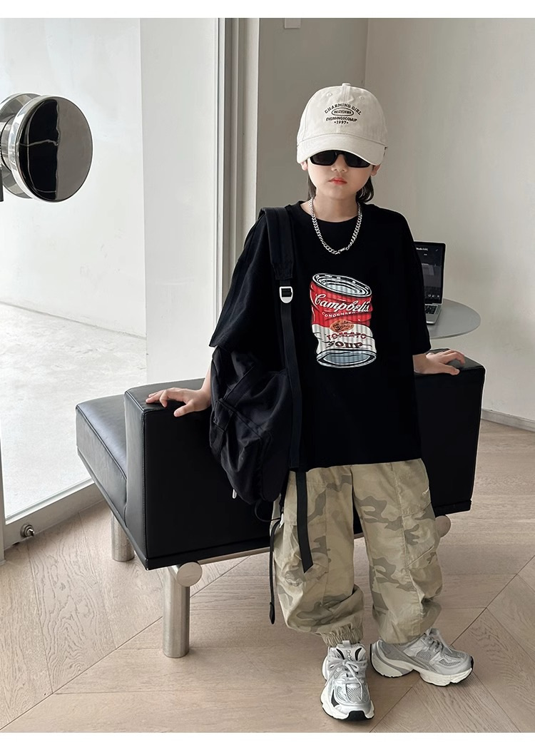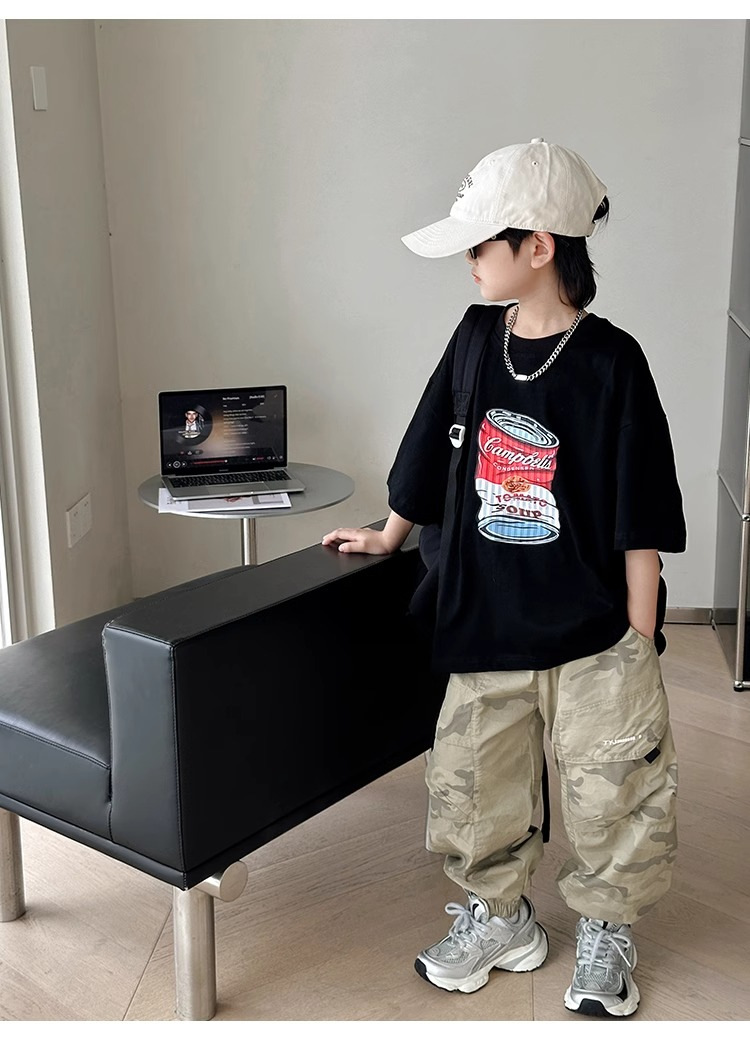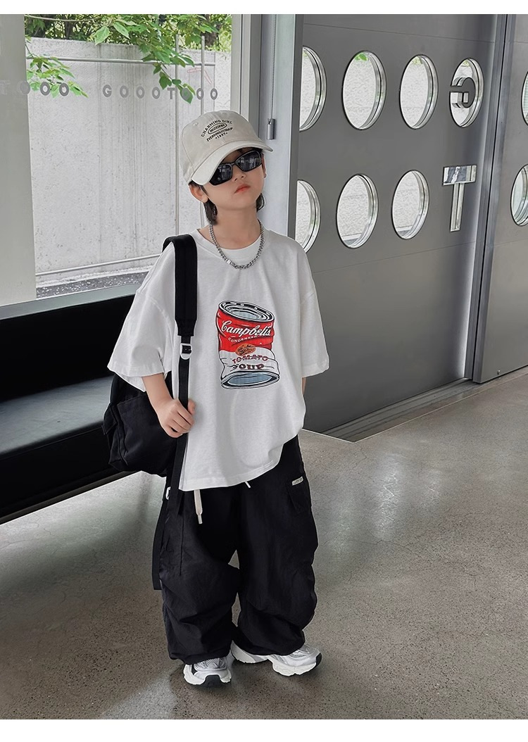 남학생 반소매 티셔츠 어린이 서양식 반소매 여름 2024 새로운 스타일 중대형 어린이 화이트 퓨어 코튼 여름 패션 쿨스토어 가기