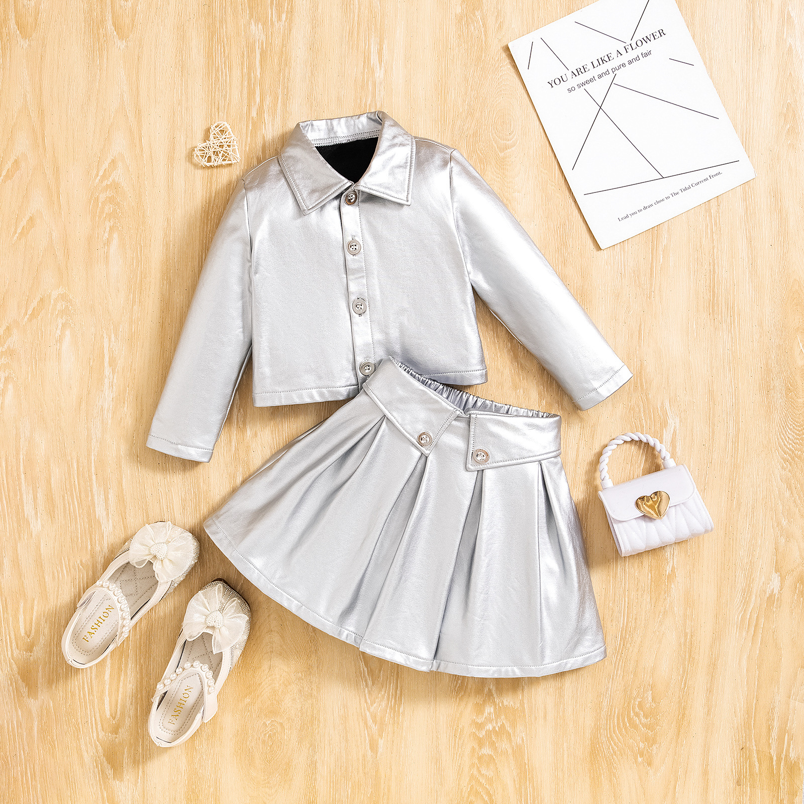 어린이 착용 세트 국경 유럽 및 미국 아마존 가을 및 겨울 소녀 밝은 옷깃 싱글 브레스트 코트 PU 가죽 스커트스토어 가기