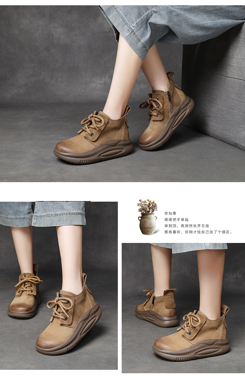 2024 가을 겨울 신상 무광 천연 소가죽 레트로 캐주얼 하이탑 두꺼운 밑창 레이스업 라운드 토 여성화