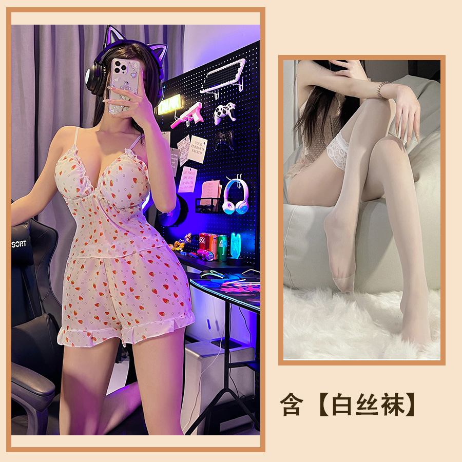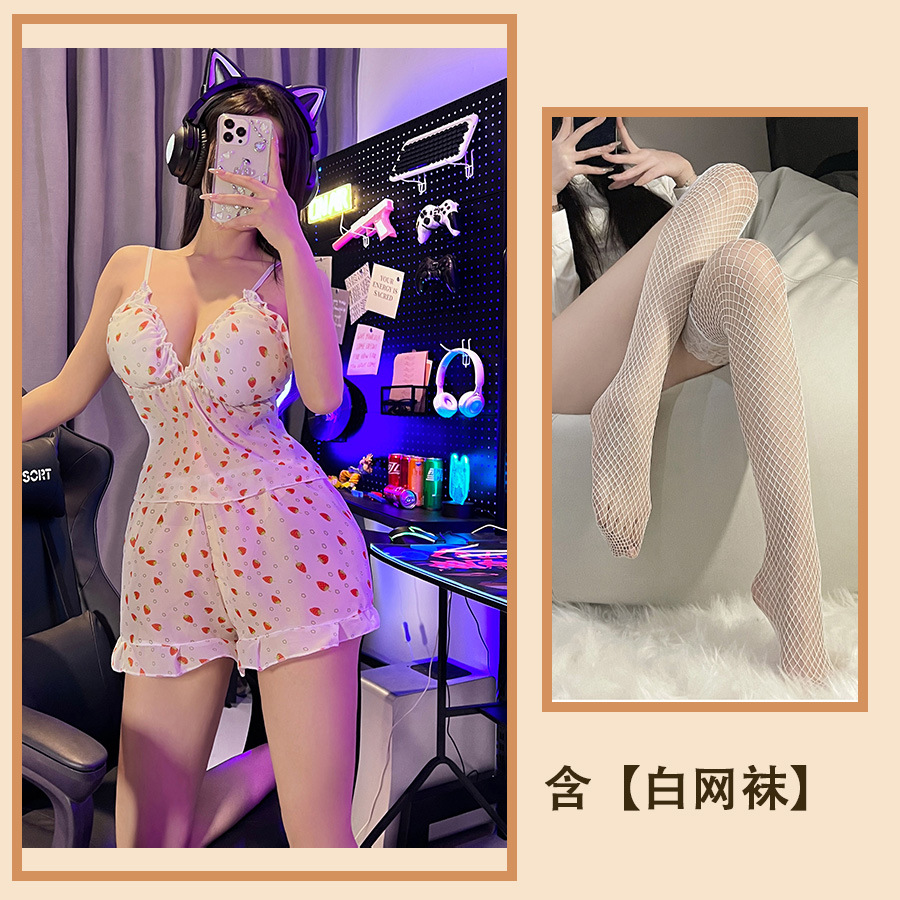 황금 밤 섹시한 란제리 여름 섹시한 소녀 딸기 시폰 파자마 슬링 새로운 달콤한 귀여운 투피스 세트스토어 가기