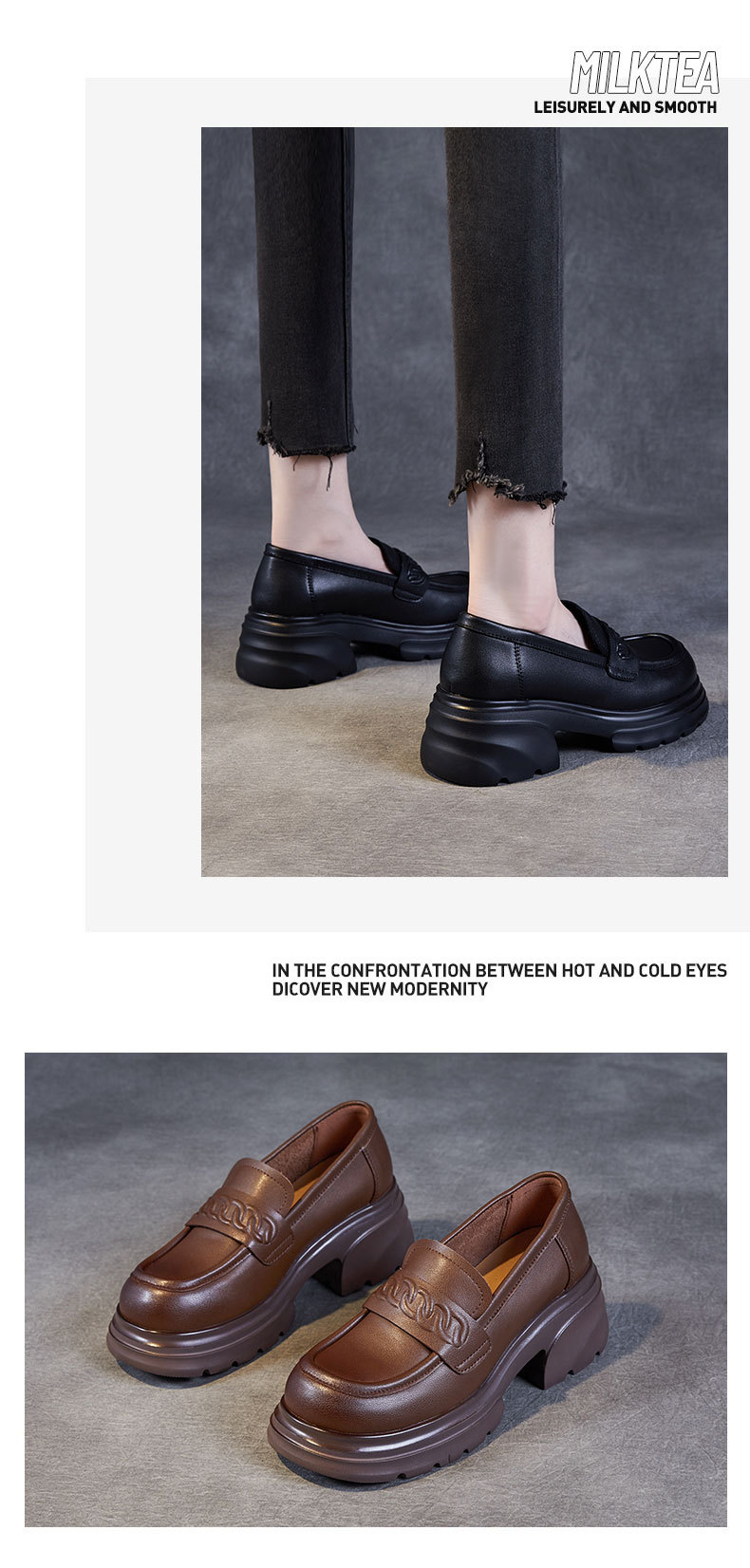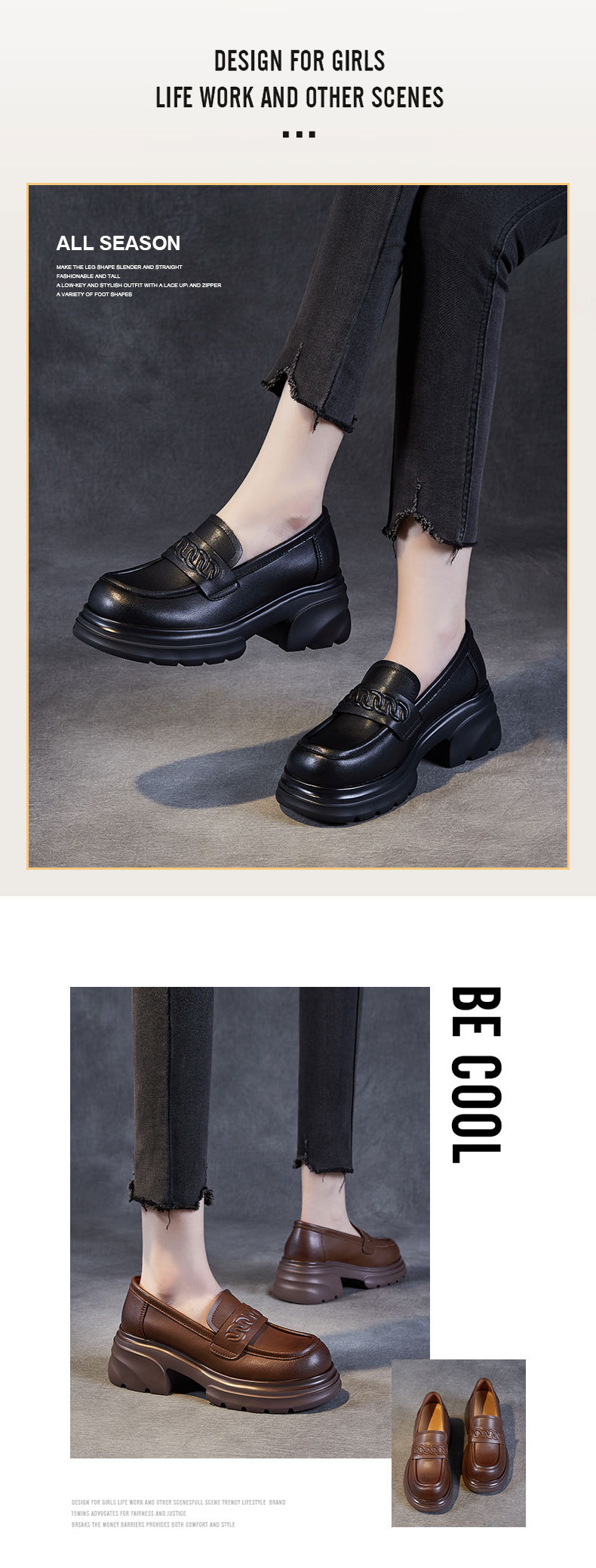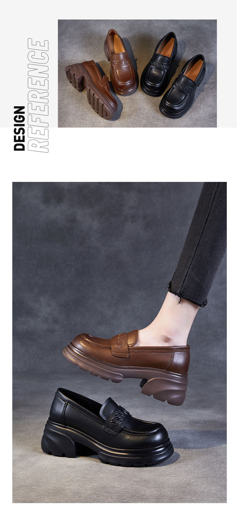 여성용 복고풍 영국 소가죽 신발 2025 새로운 스타일의 둥근 앞코 두꺼운 굽 두꺼운 밑창 로퍼 다용도 슬립온 신발 도매