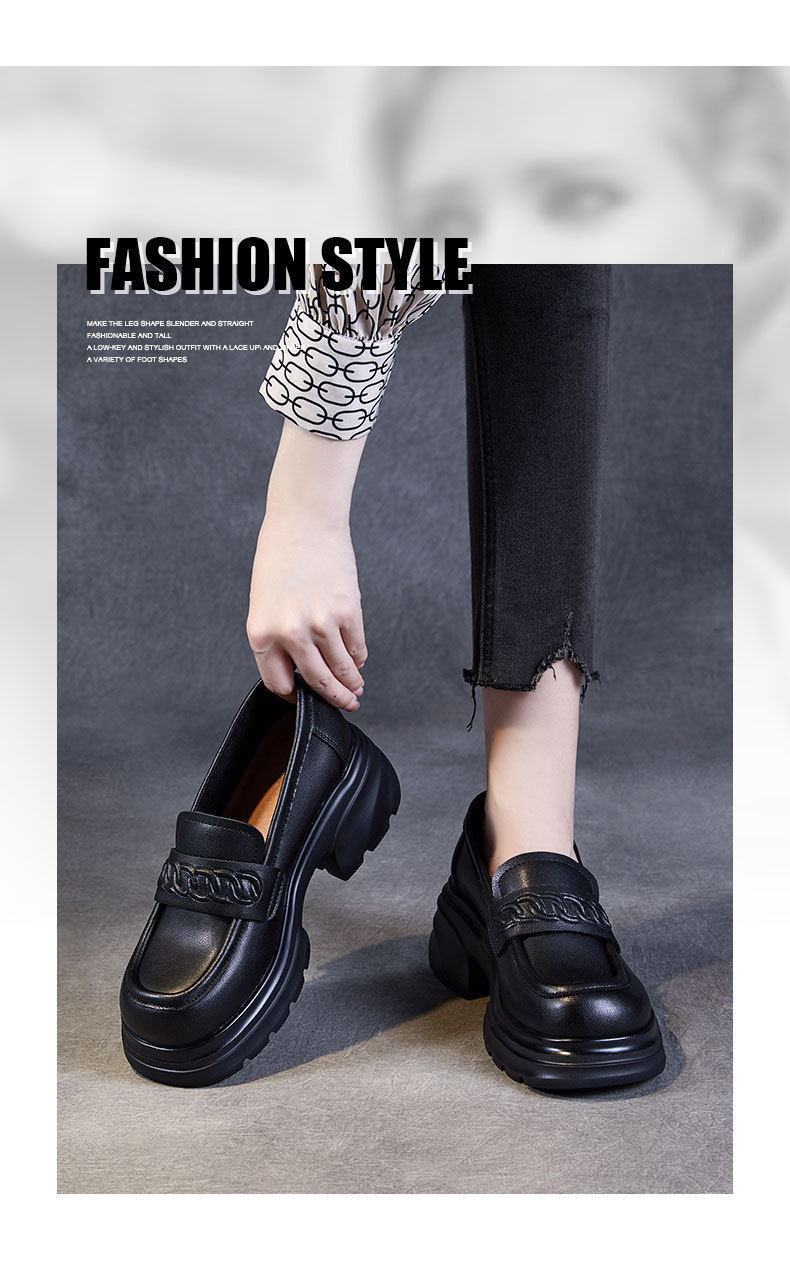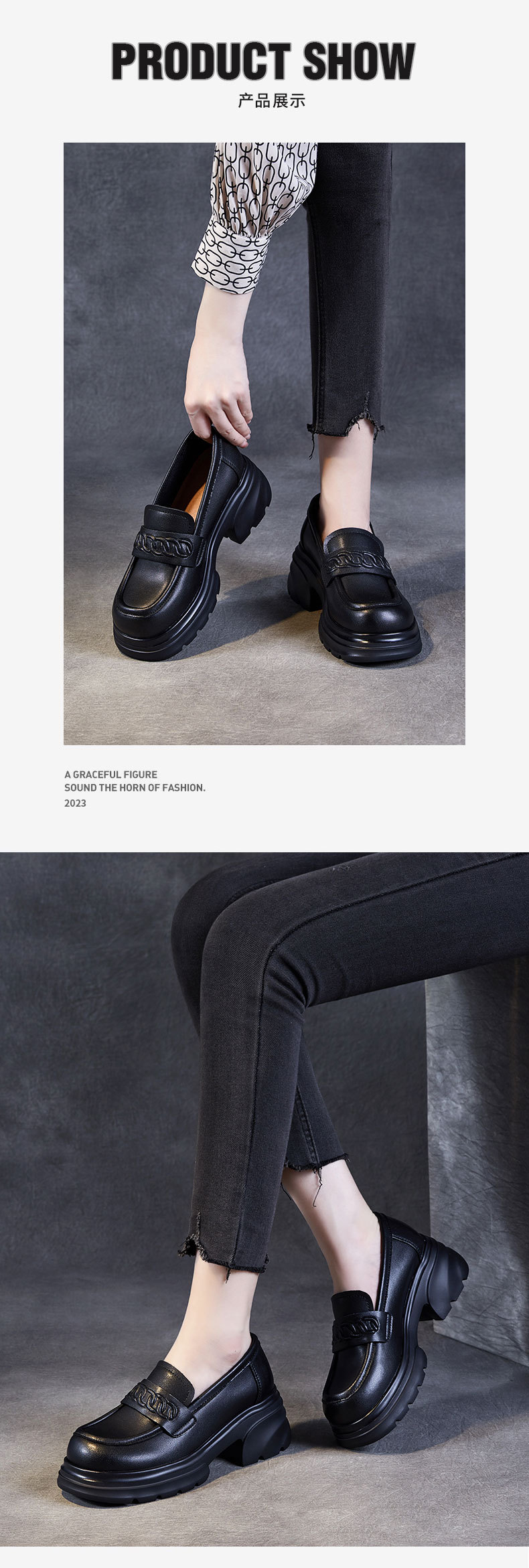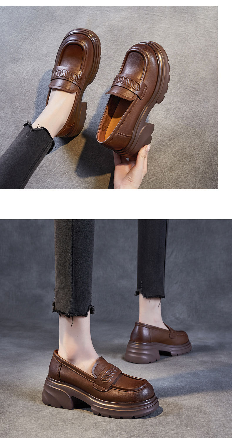여성용 복고풍 영국 소가죽 신발 2025 새로운 스타일의 둥근 앞코 두꺼운 굽 두꺼운 밑창 로퍼 다용도 슬립온 신발 도매