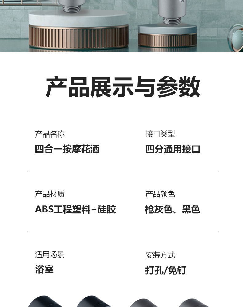 • 【SA-39】건메탈 그레이 【필터 가압】 3단 분사 마사지 샤워기 + 무타공 거치대