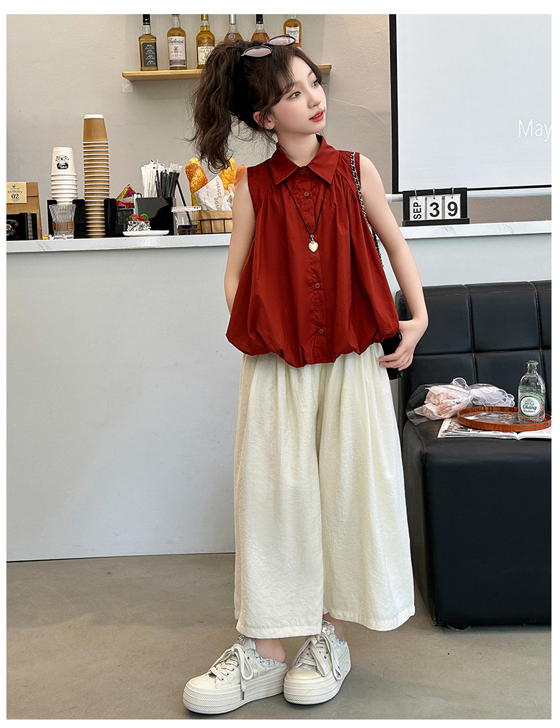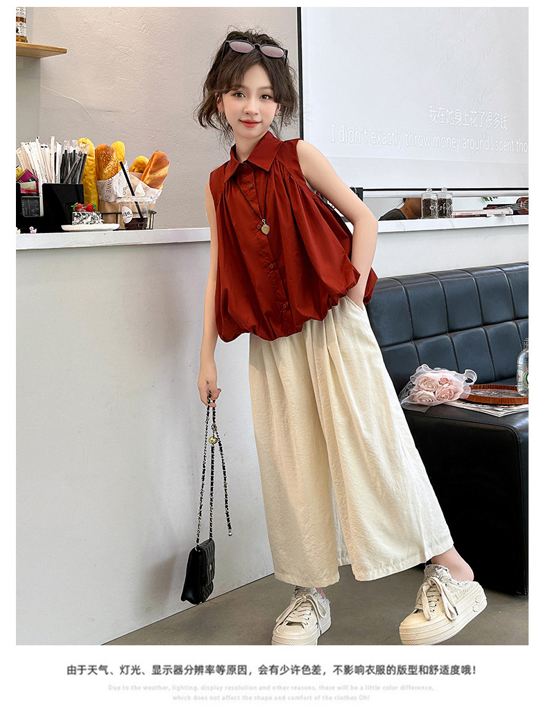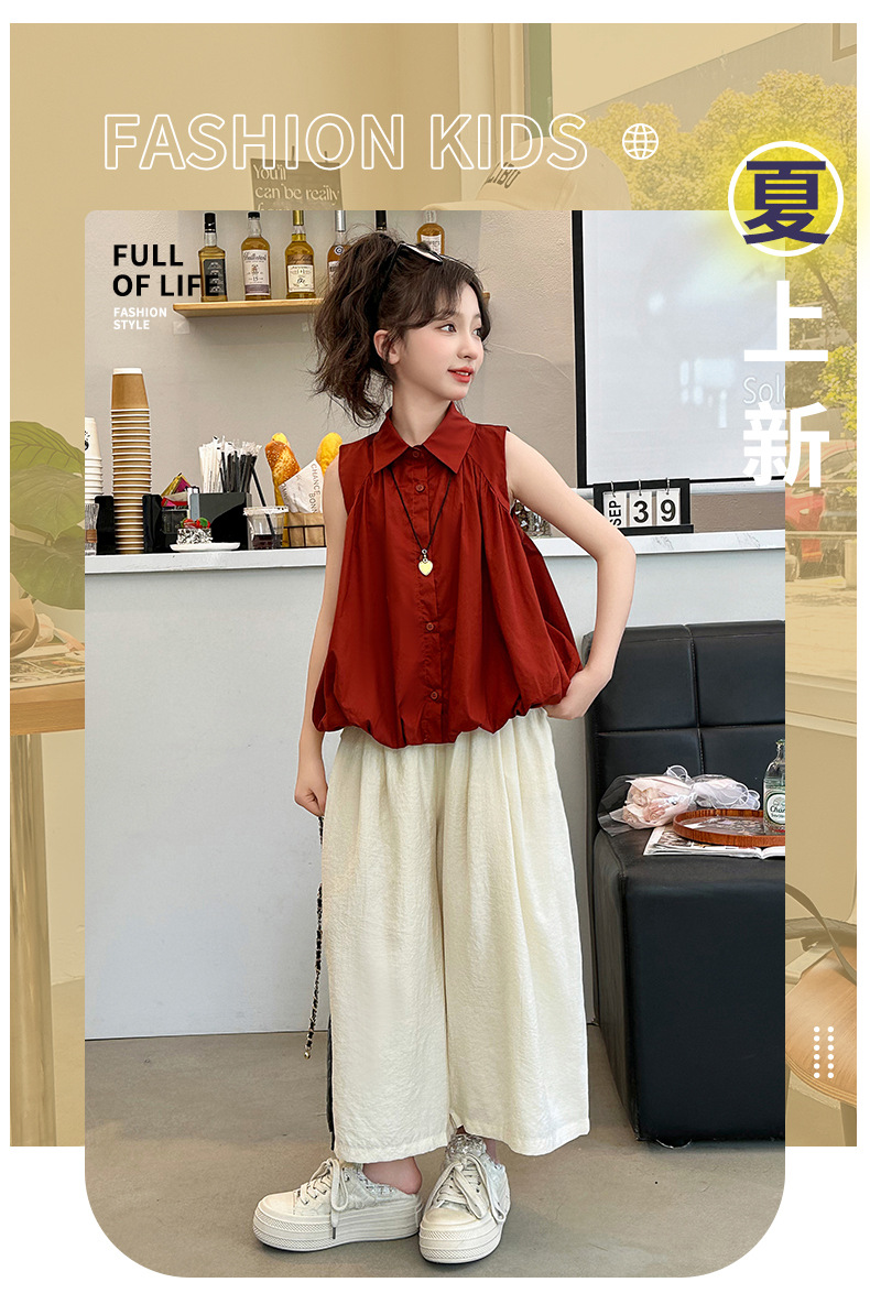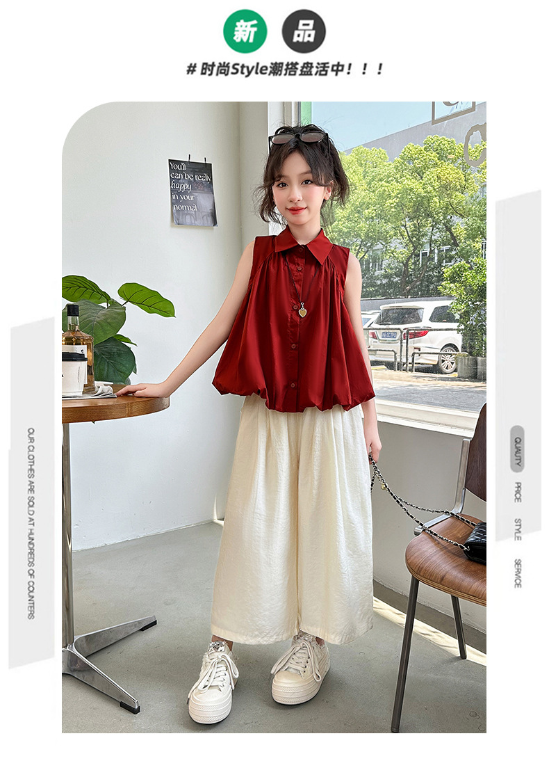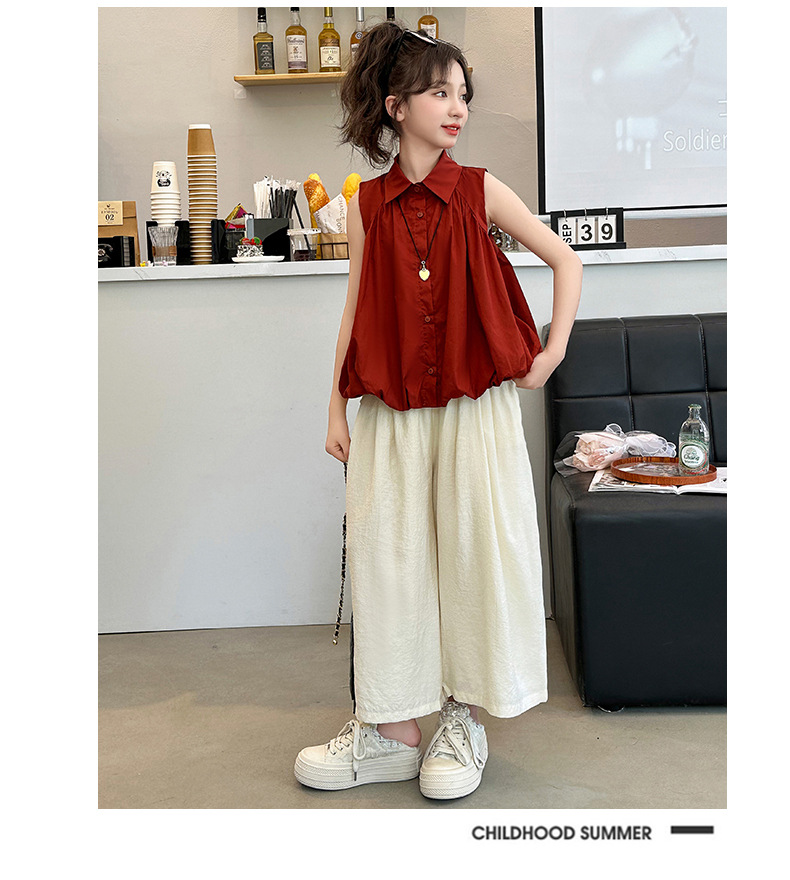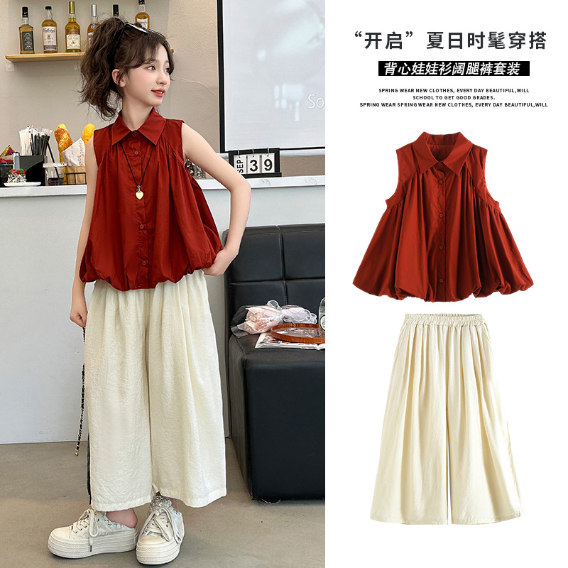 소녀 여름 작은 비행 소매 셔츠 세트 2024 여름 새로운 스타일 셔츠 어린이 짧은 소매 바지 투피스 세트