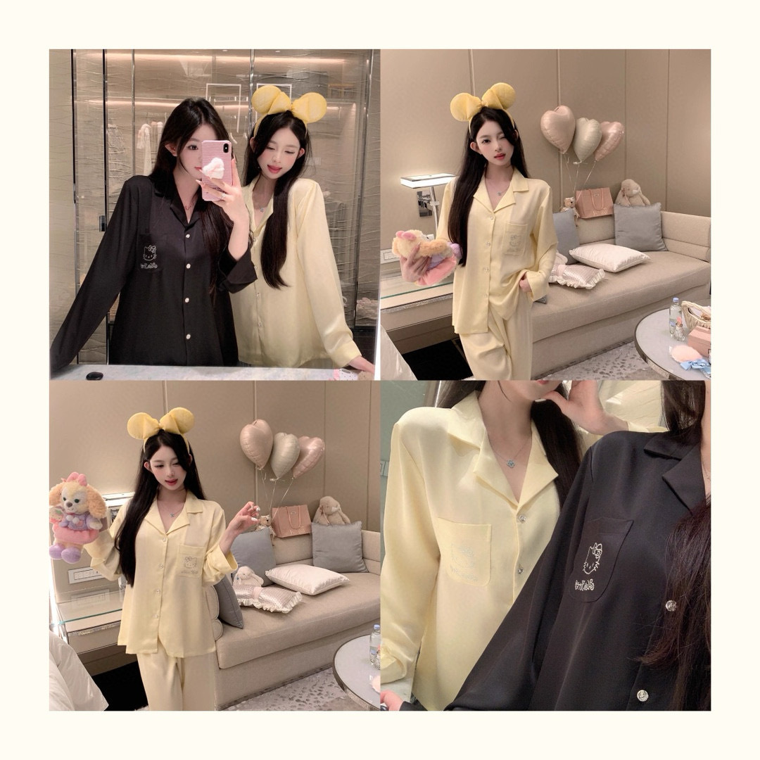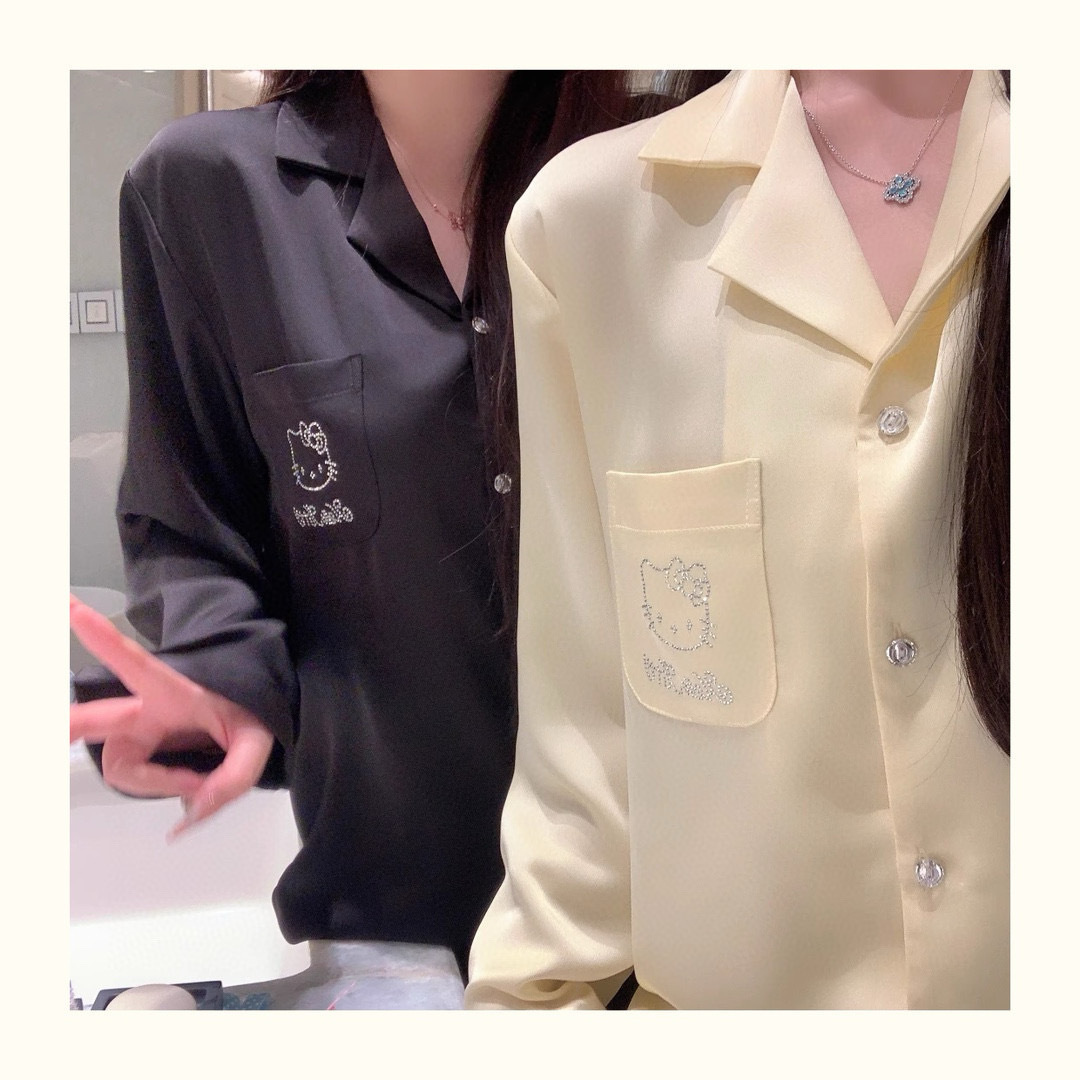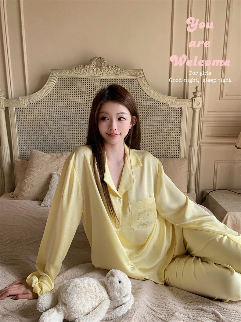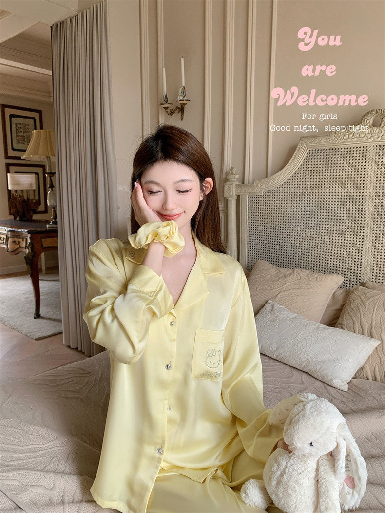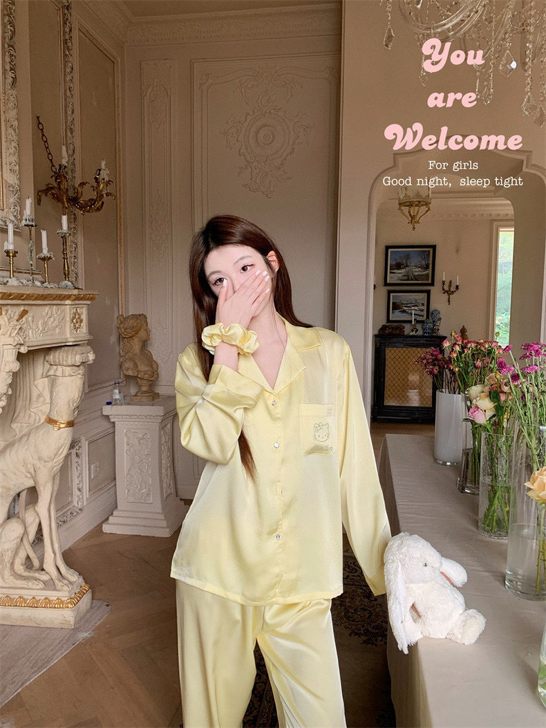 금도금 키티 한국 스타일 핫 드릴링 고급 아이스 실크 파자마 여성 세트 긴팔 봄 가을 인터넷 연예인 새틴 홈 의류 여성스토어 가기