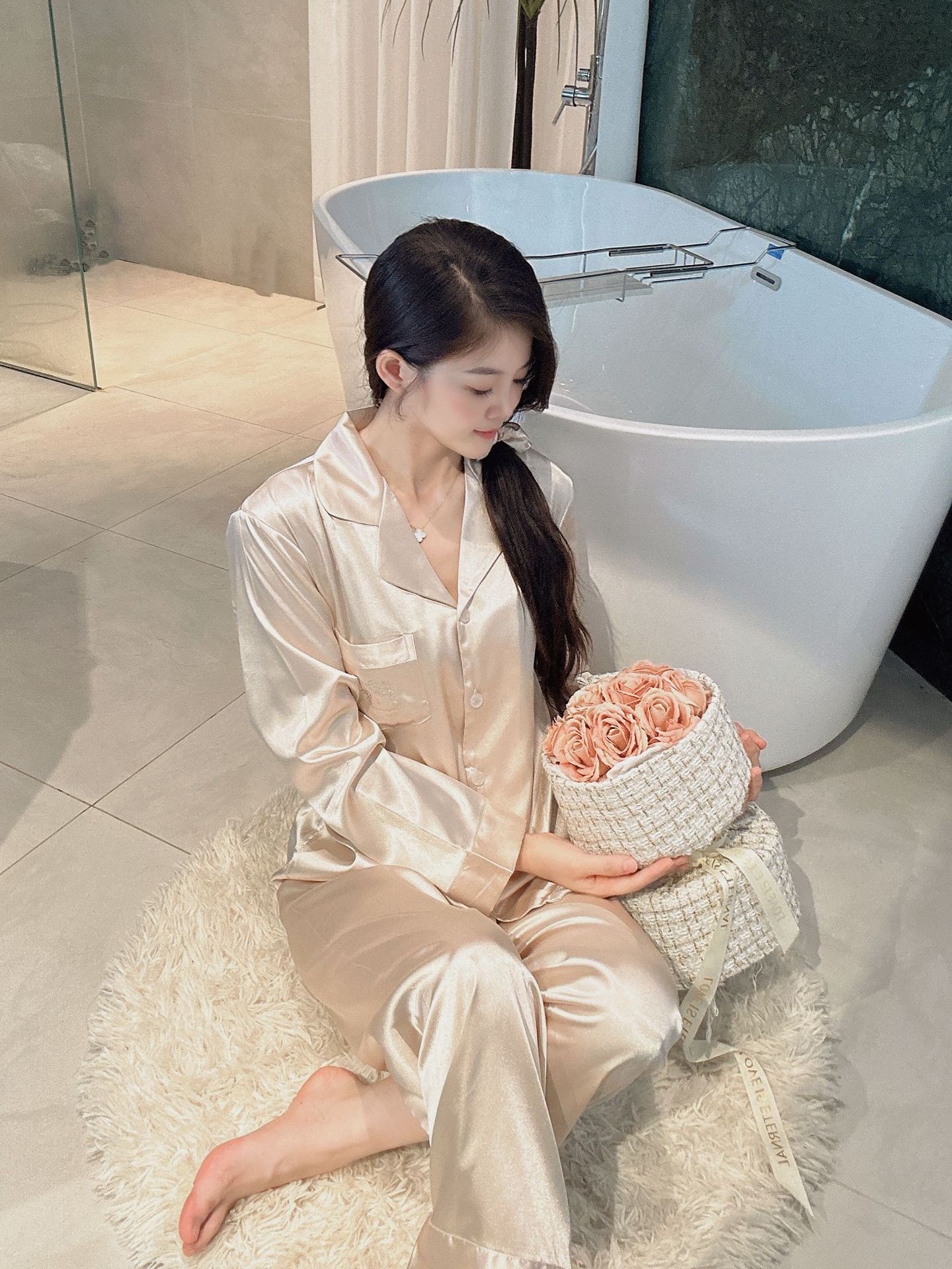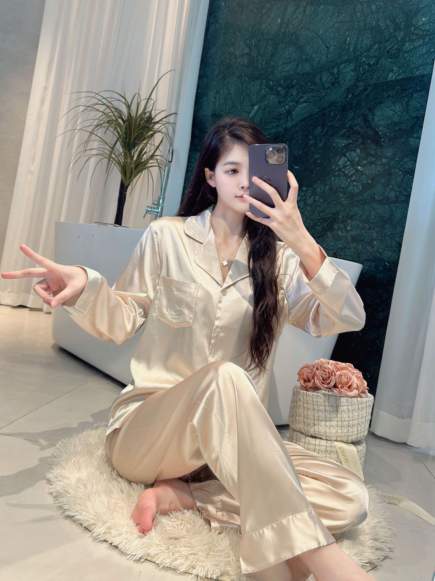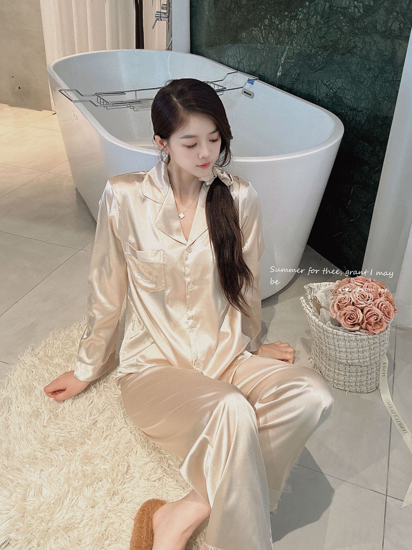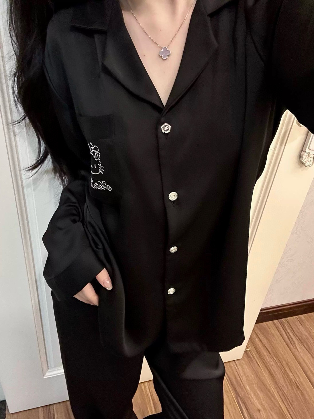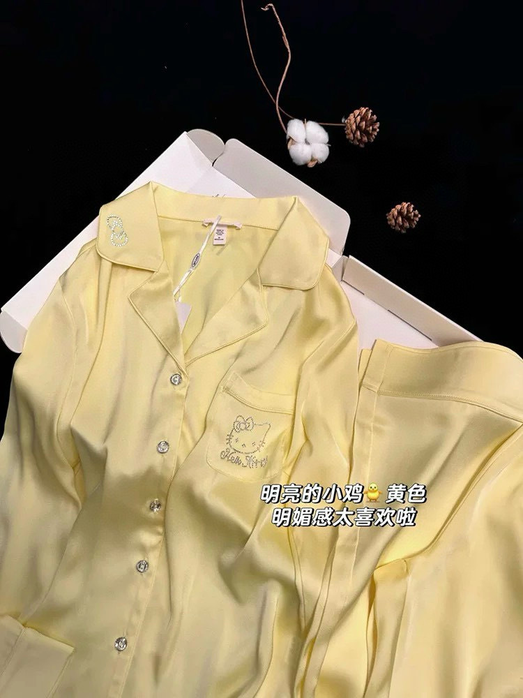 금도금 키티 한국 스타일 핫 드릴링 고급 아이스 실크 파자마 여성 세트 긴팔 봄 가을 인터넷 연예인 새틴 홈 의류 여성스토어 가기