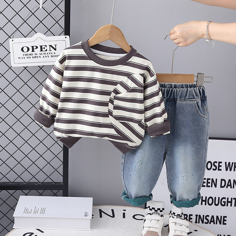2024 어린이 가을 옷 어린 소년의 외국 스타일 스트라이프 크루 넥 스웨터 세트 아기 잘 생긴 청바지스토어 가기