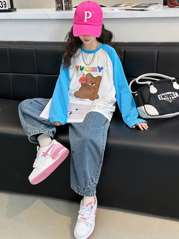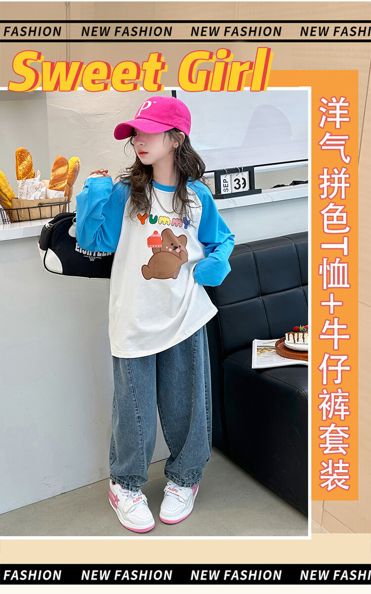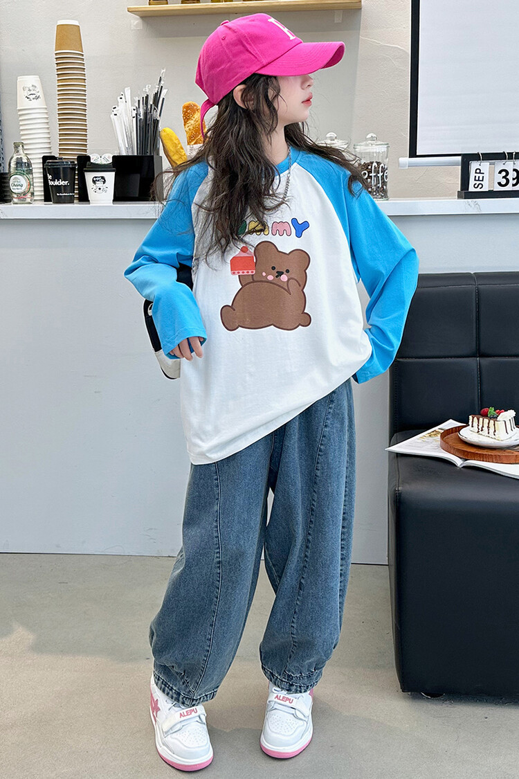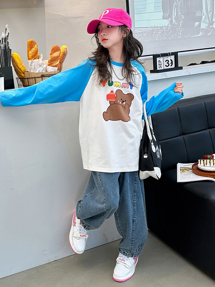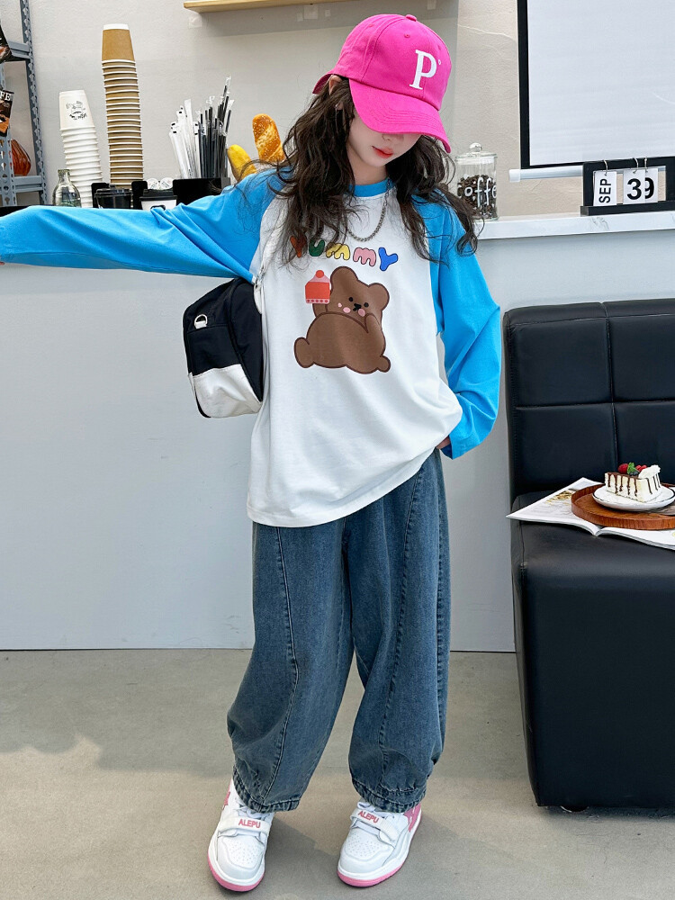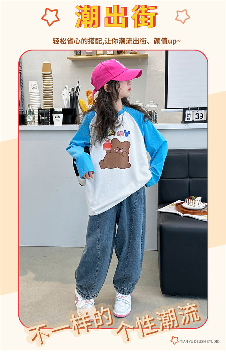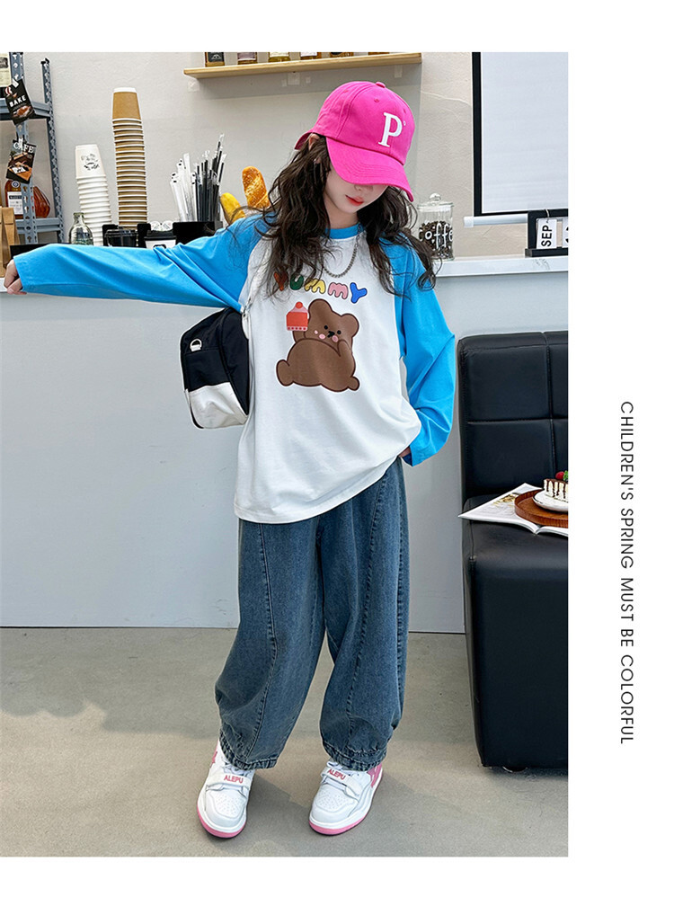 소녀 세트 봄과 가을 2024 새로운 중다 어린이 청바지 긴 소매 컬러 블록 만화 티셔츠 캐주얼 루즈스토어 가기