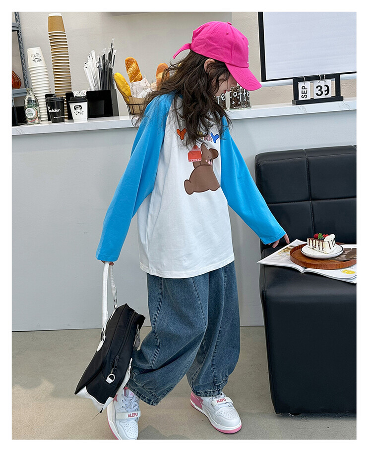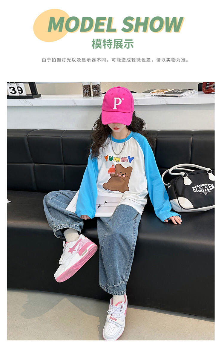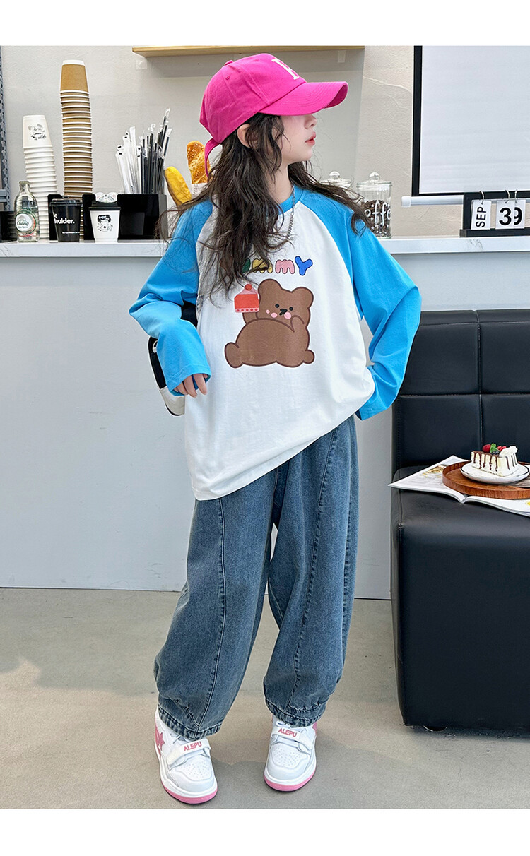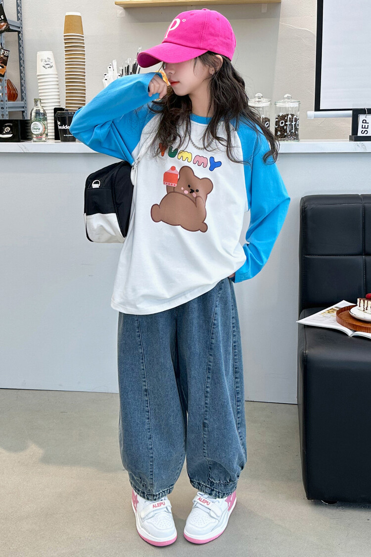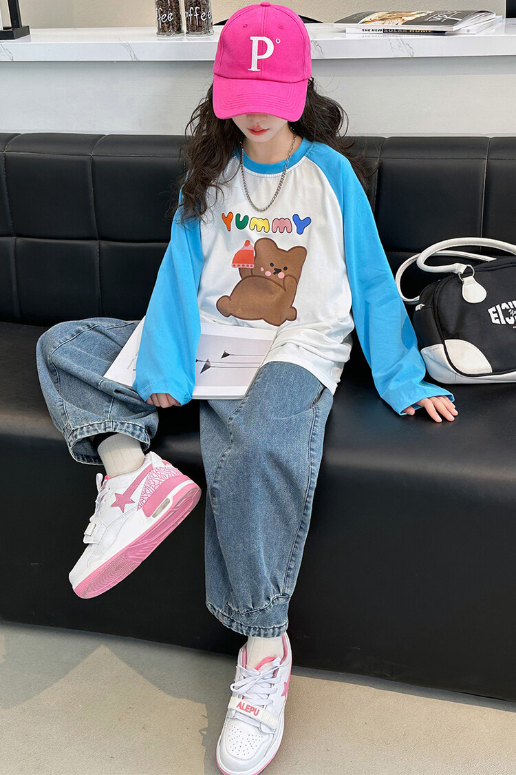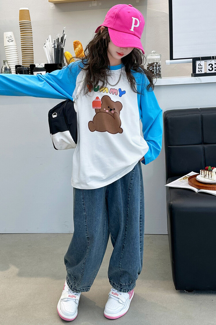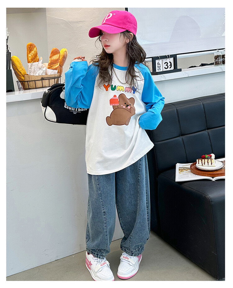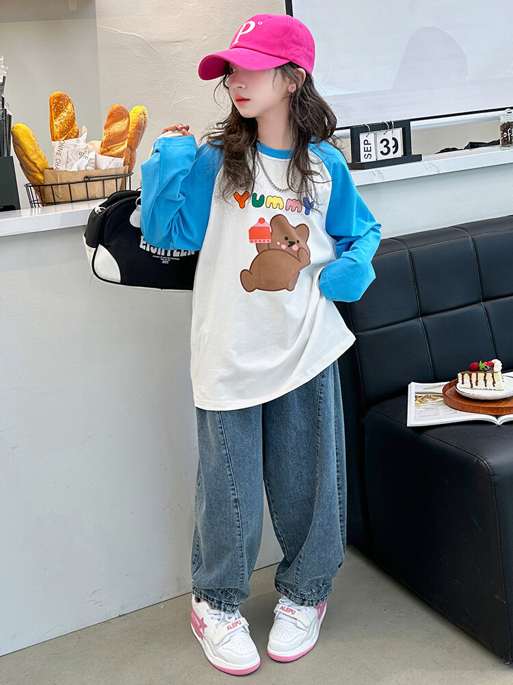 소녀 세트 봄과 가을 2024 새로운 중다 어린이 청바지 긴 소매 컬러 블록 만화 티셔츠 캐주얼 루즈스토어 가기