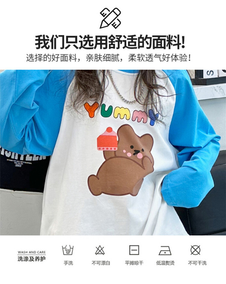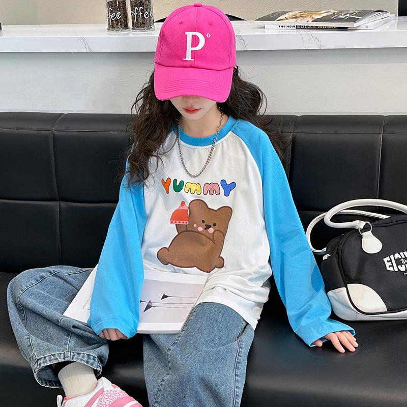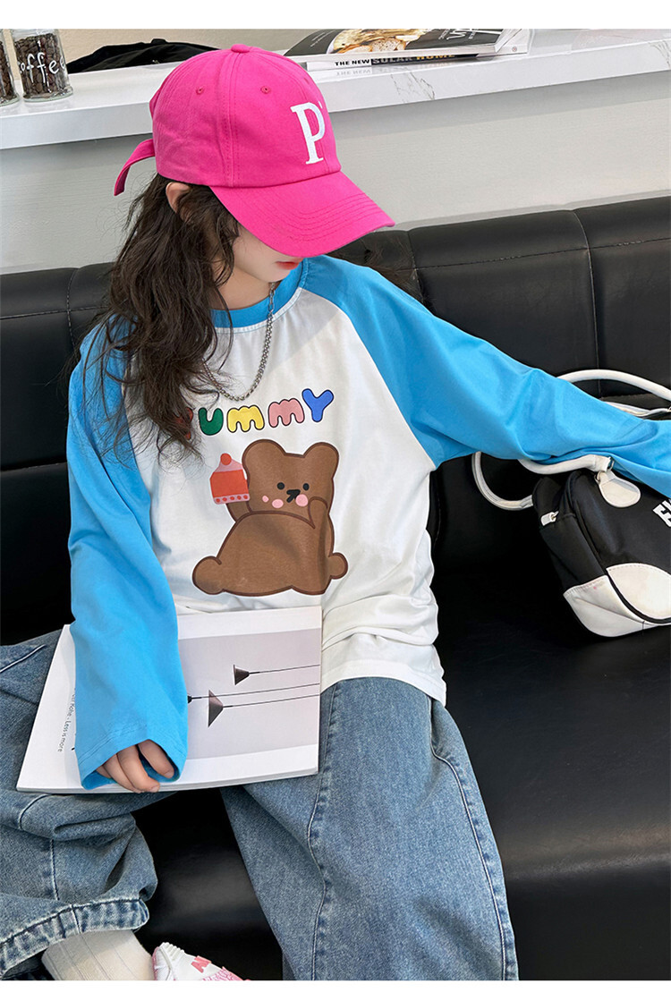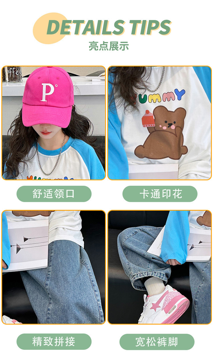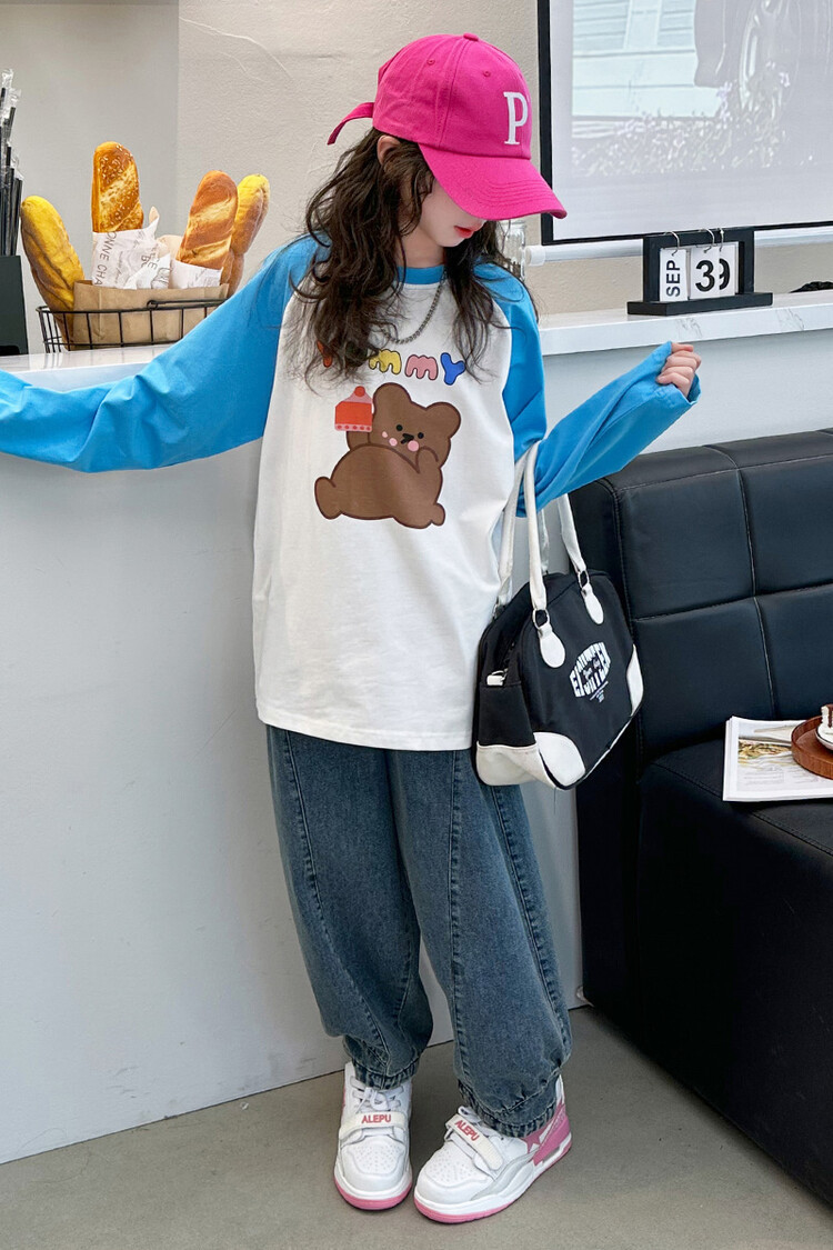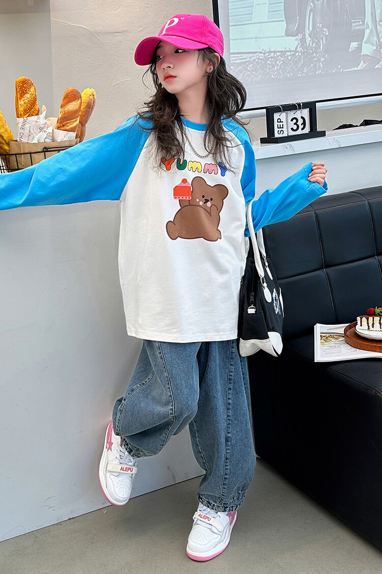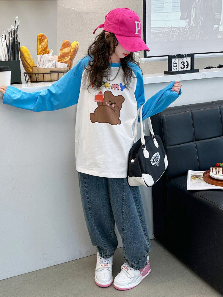 소녀 세트 봄과 가을 2024 새로운 중다 어린이 청바지 긴 소매 컬러 블록 만화 티셔츠 캐주얼 루즈스토어 가기