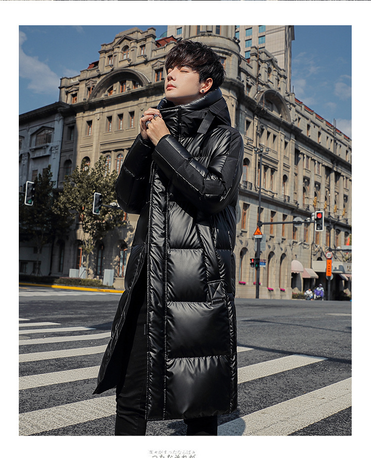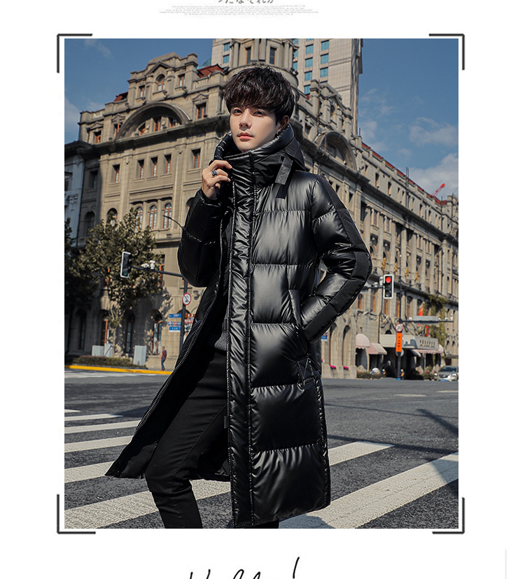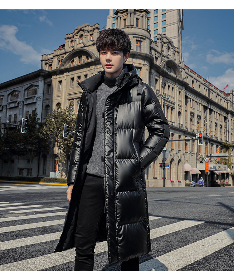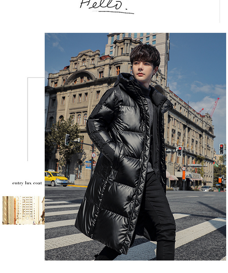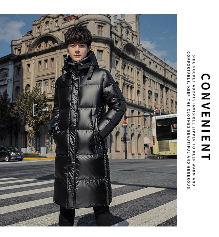 2024 겨울 청소년 광택 무릎 위 화이트 오리 다운 재킷 남성용 두꺼운 후드 방수 롱 코트 트렌디스토어 가기