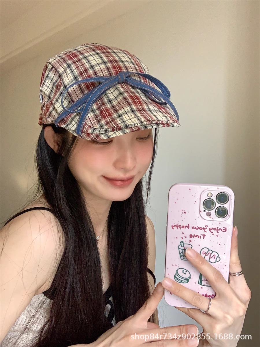 달콤한 맛 ~ 활 넥타이 업 격자 앞으로 모자 여성의 달콤한 여름 얇은 유행 안티 베레 트렌디