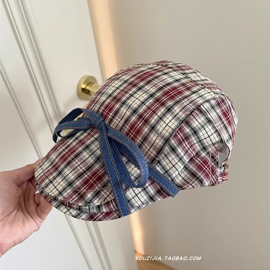 달콤한 맛 ~ 활 넥타이 업 격자 앞으로 모자 여성의 달콤한 여름 얇은 유행 안티 베레 트렌디스토어 가기