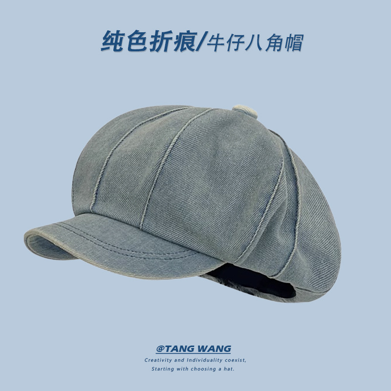 세탁 된 데님 구름 모자 여성 레트로 오래 된 주름 화가의 모자 단색 모든 얼굴 쇼 작은 예술적 팔각형 모자스토어 가기