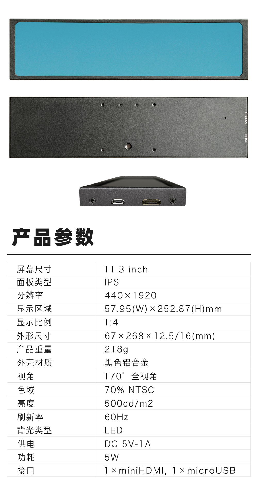 11.3inch 긴 스트립 화면 HDMI 고화질 디스플레이 섀시 온도 모니터링 화면 컴퓨터 보조 화면 IPS 휴대용 화면