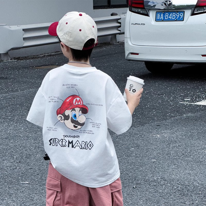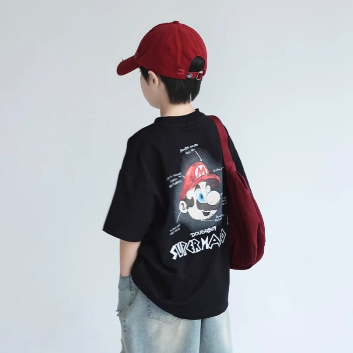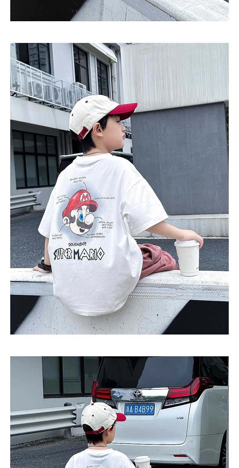소년 반팔 티셔츠 어린이 여름 2024 여름 새로운 도착 소년 느슨한 만화 탑 유행 브랜드 뚱뚱한 잘 생긴 티셔츠