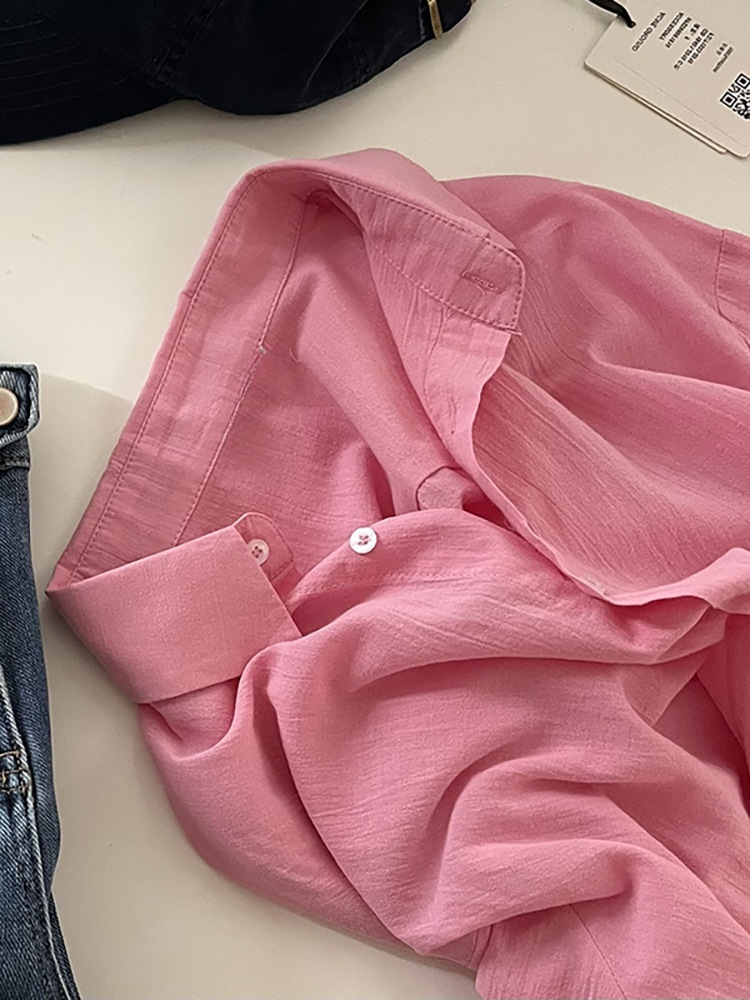 주름 질감 고급 핑크 얇은 캐주얼 셔츠 여성의 2024 여름 새로운 선 스크린 셔츠 달콤한 탑