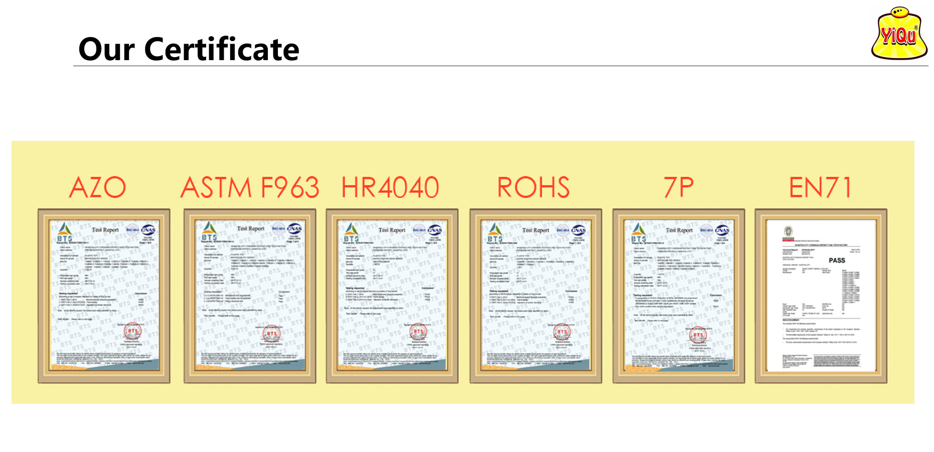 产品品质符合欧美质量标准,有EN71、ASTM、HR4040、CPSIA、CPC、CE等认证。