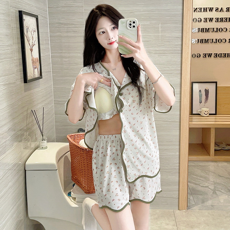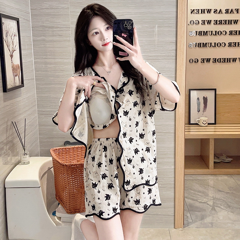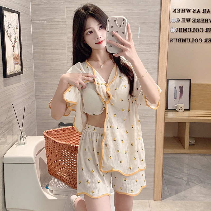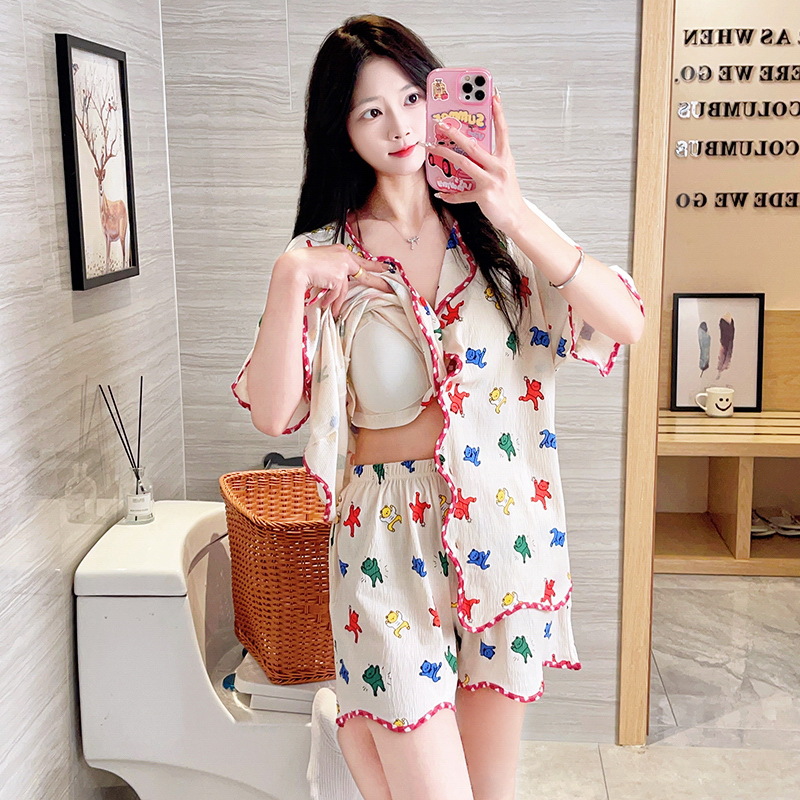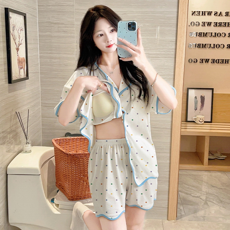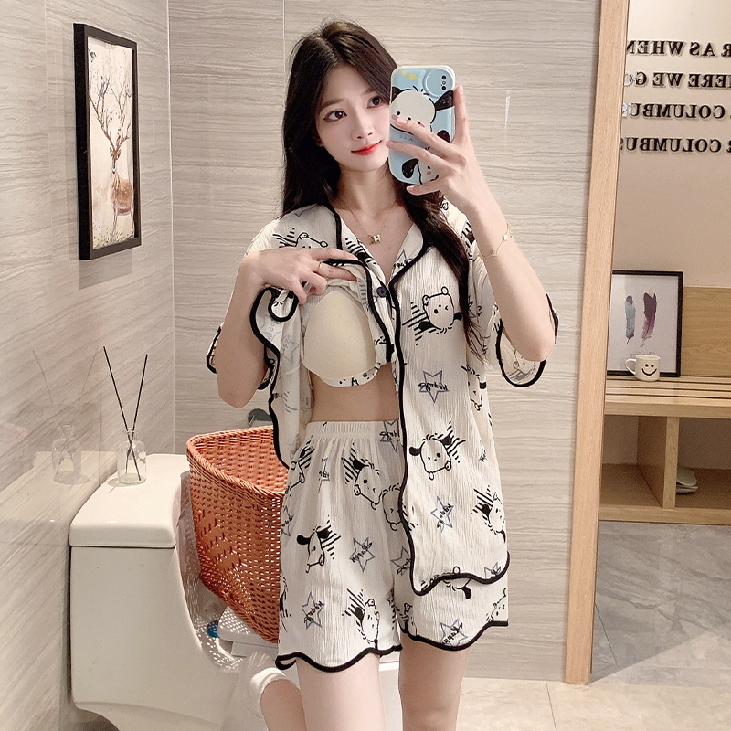 여성용 여름 반팔 반바지 잠옷, 가슴 패드가 있는 얇은 한국식 달콤한 볼록 방지 가디건, 홈웨어 세트, 무인쇄스토어 가기