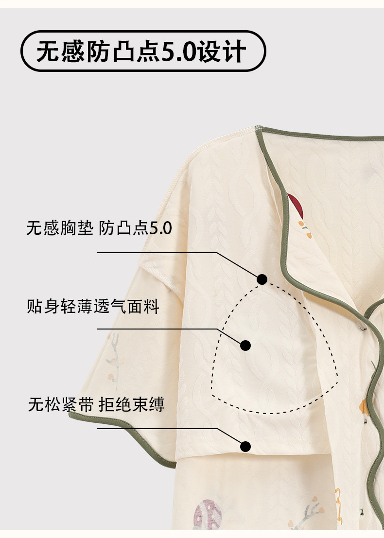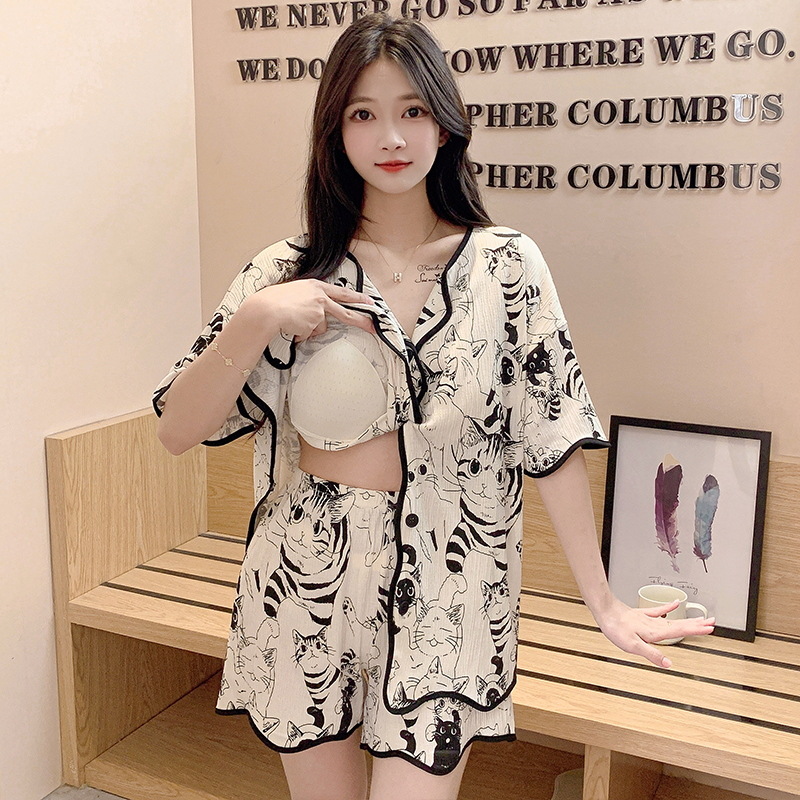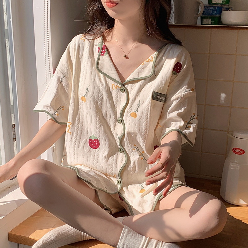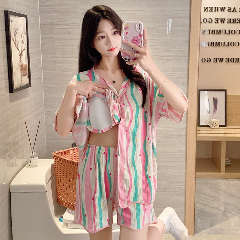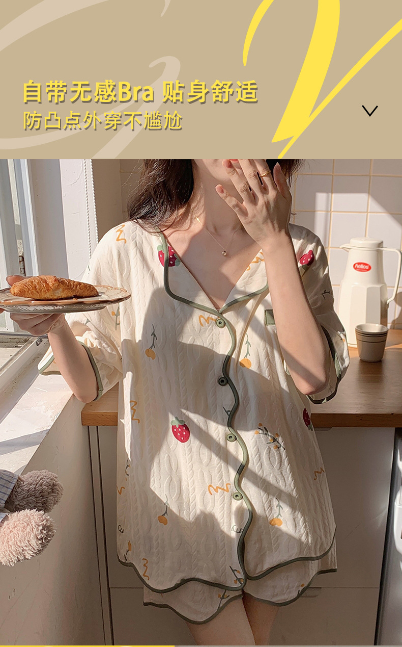여성용 여름 반팔 반바지 잠옷, 가슴 패드가 있는 얇은 한국식 달콤한 볼록 방지 가디건, 홈웨어 세트, 무인쇄스토어 가기
