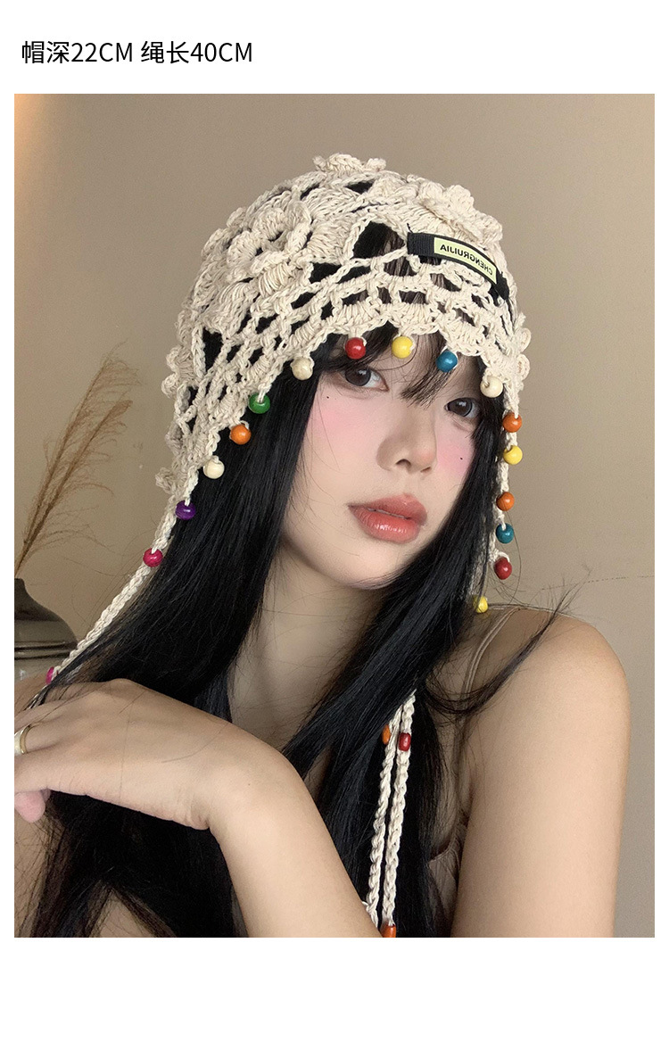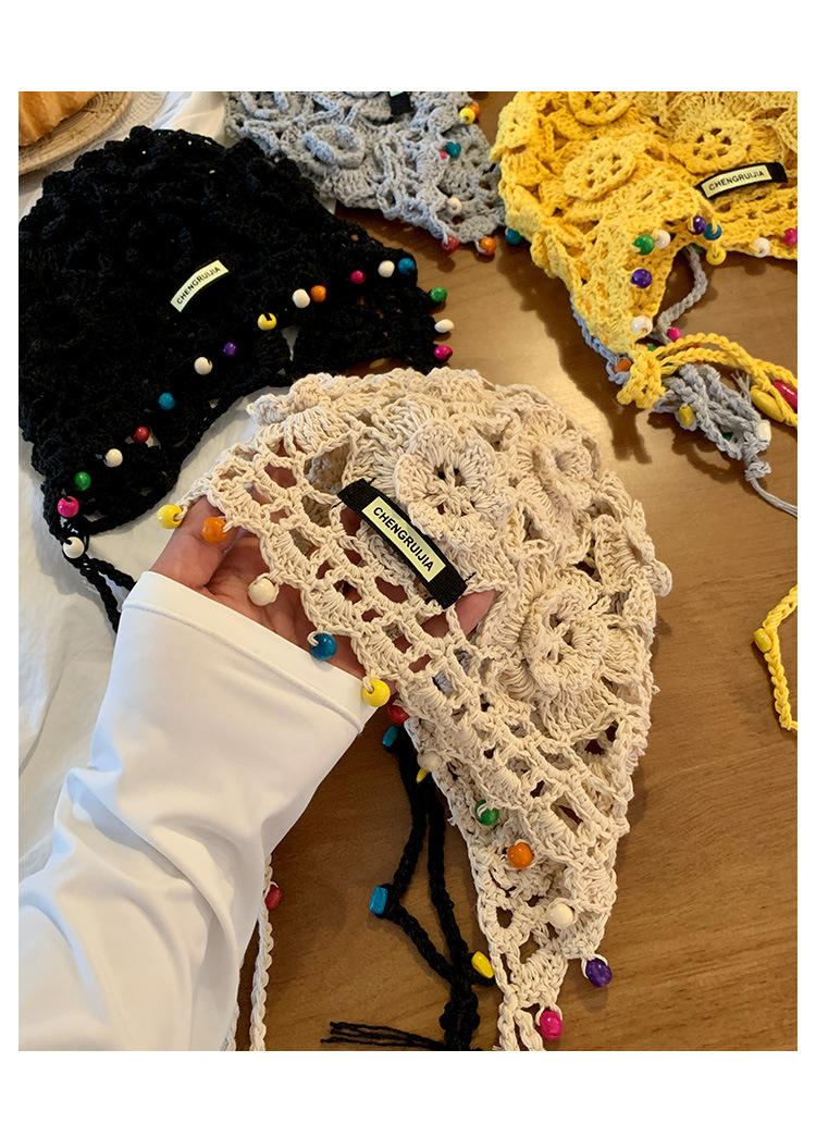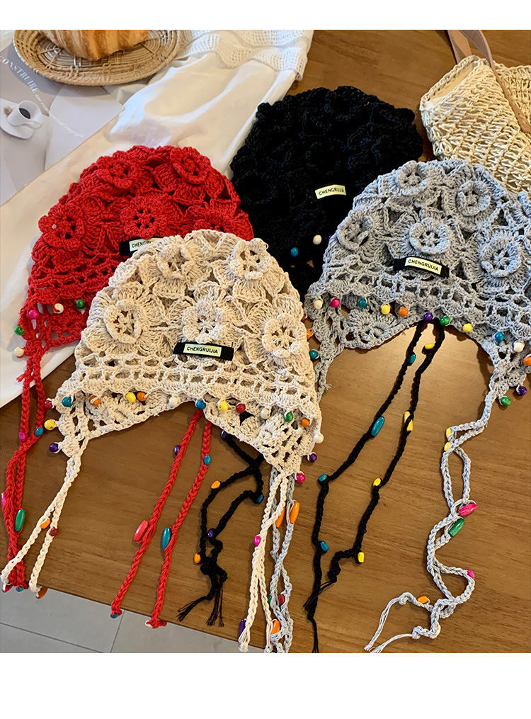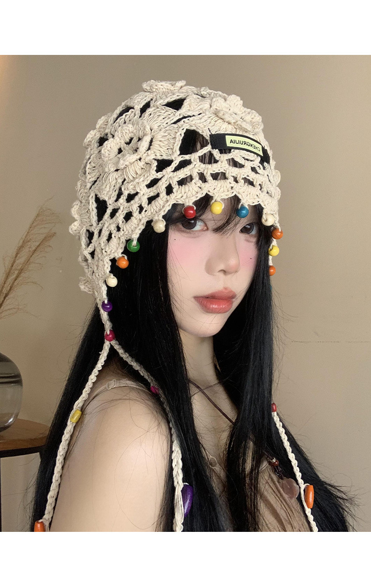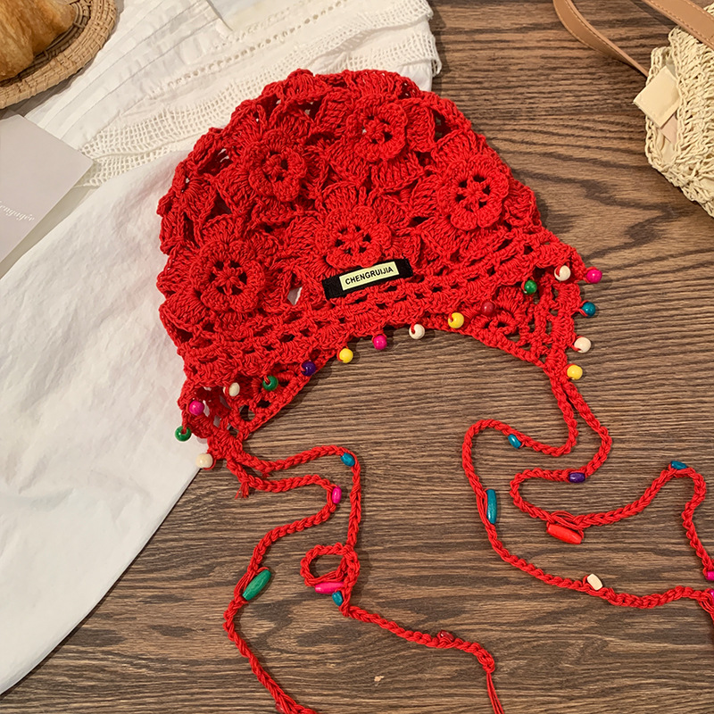 빈티지 할로우 보헤미안 꽃 술 짠 가방 머리 모자 여성 민족 스타일 풀오버 모자 수제 니트 모자