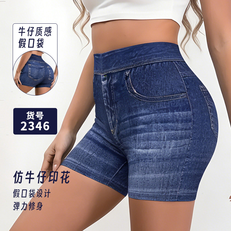 유럽과 미국의 요가 피트니스 바지 모조 데님 반바지 높은 허리 여성 엉덩이 슬리밍 트리플 바지 스포츠 반바지 여성 여름 아우터웨어