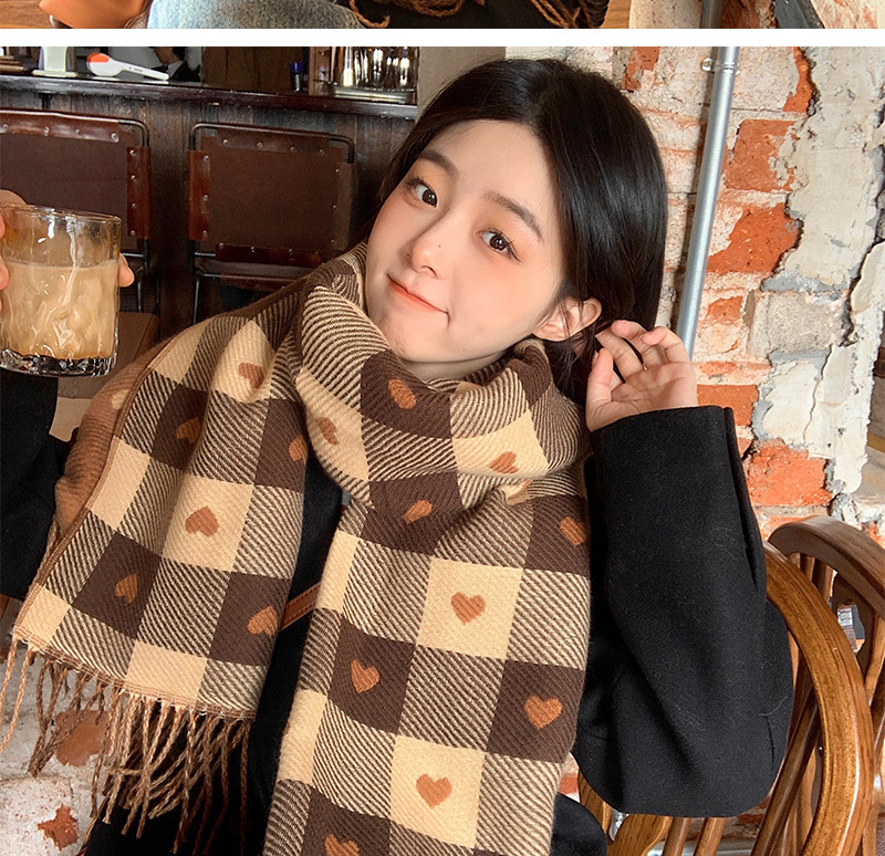 여학생용 스카프, 다용도 하트 체크무늬 겨울 커플용 커피색 보온 스카프, 절친용 한국 스타일 스카프, 인스타 감성스토어 가기
