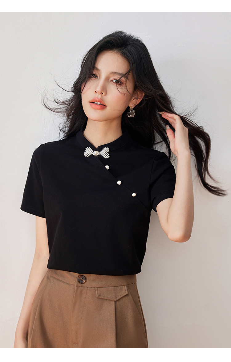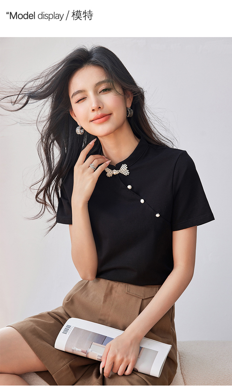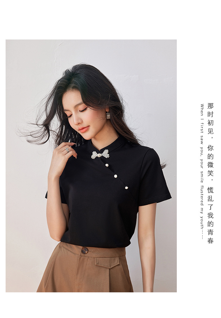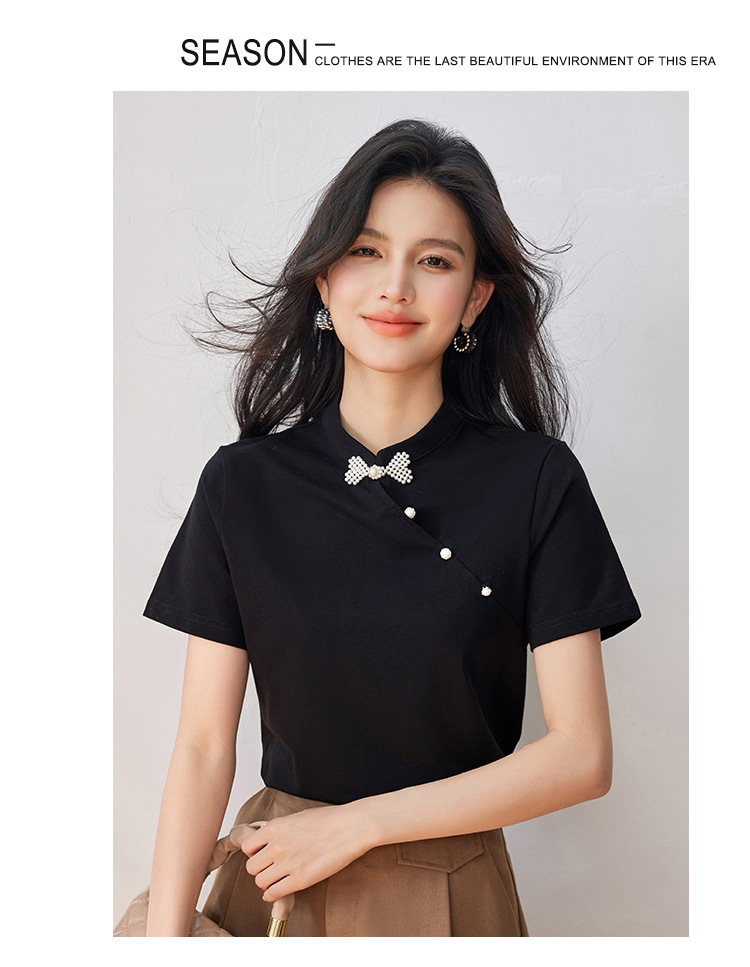 새로운 중국식 진주 버클 티셔츠 여성 반팔 2024 여름 새로운 국가 스타일 틈새 우아한 청삼 칼라 탑스토어 가기