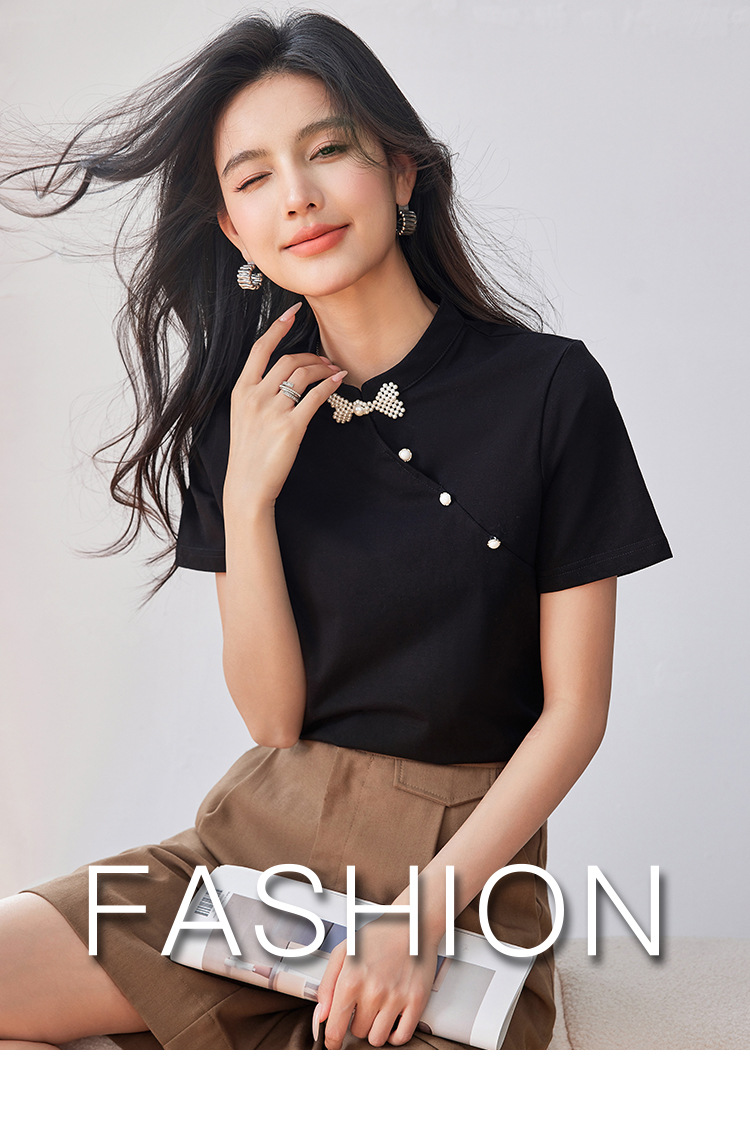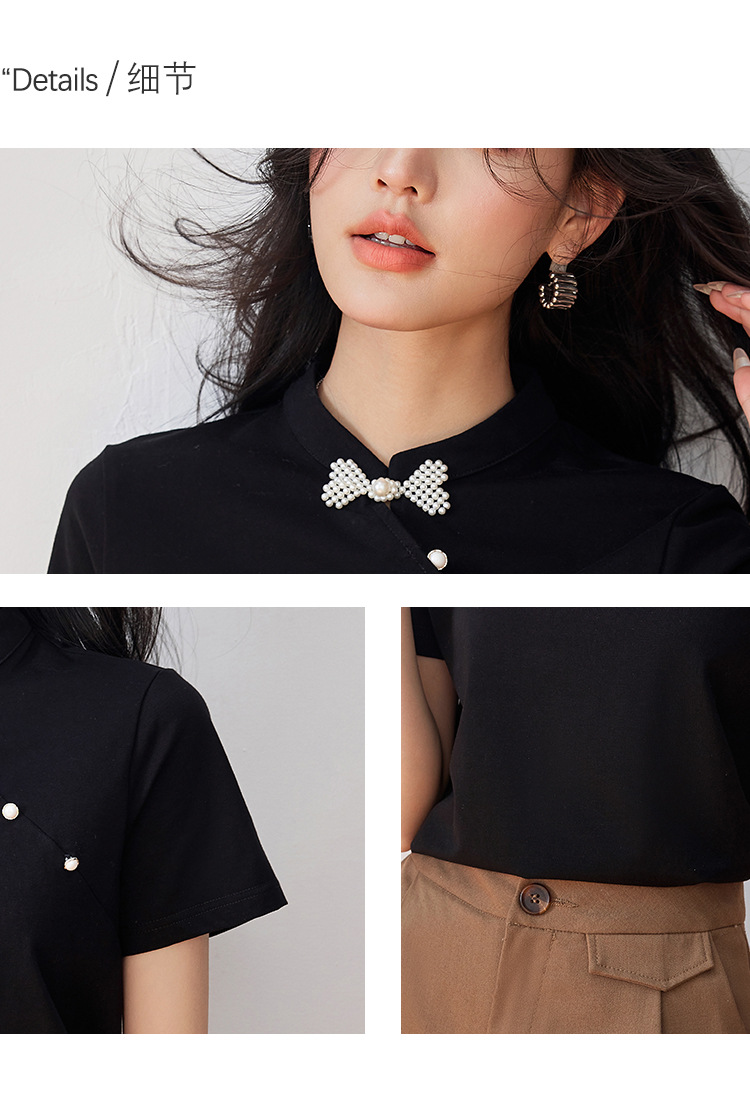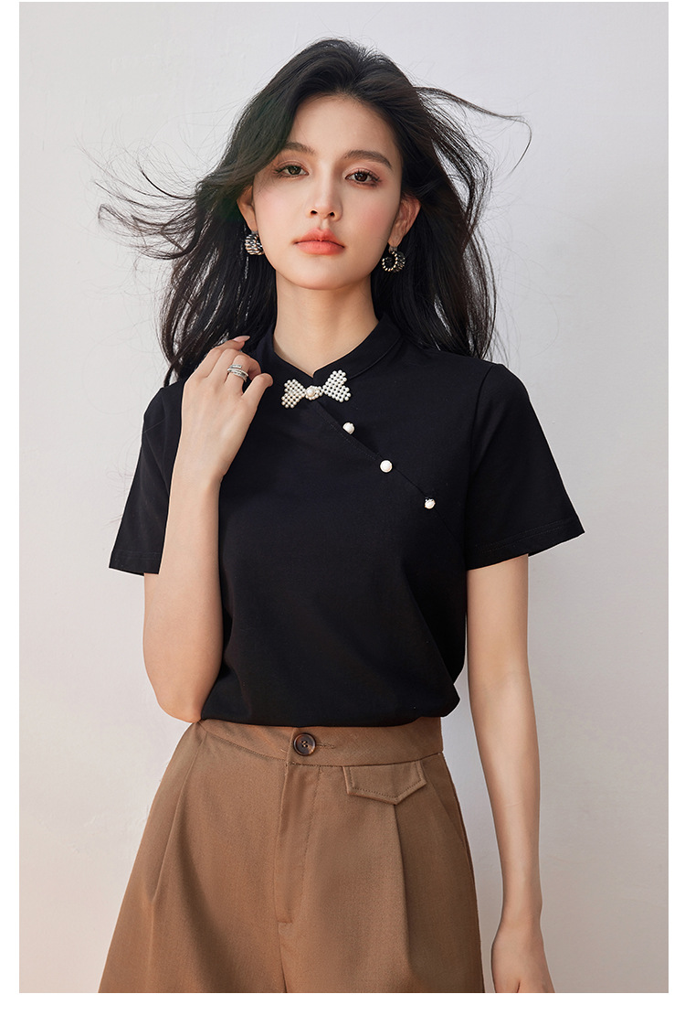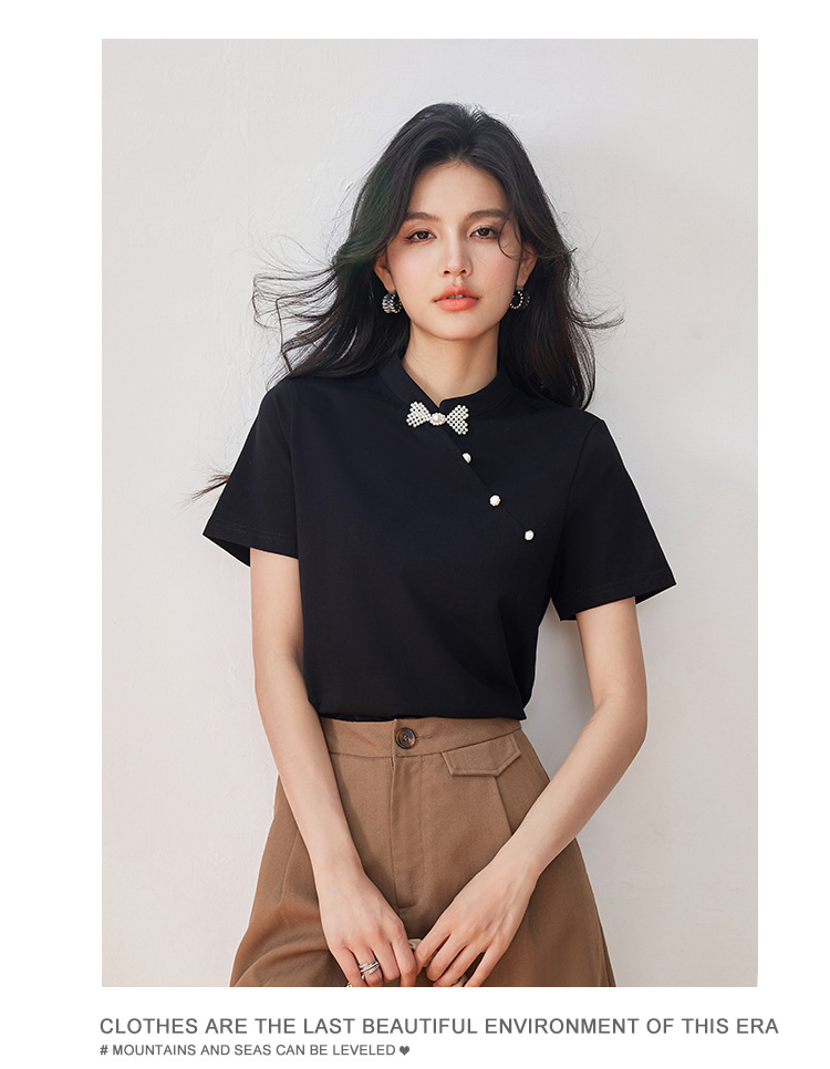새로운 중국식 진주 버클 티셔츠 여성 반팔 2024 여름 새로운 국가 스타일 틈새 우아한 청삼 칼라 탑스토어 가기