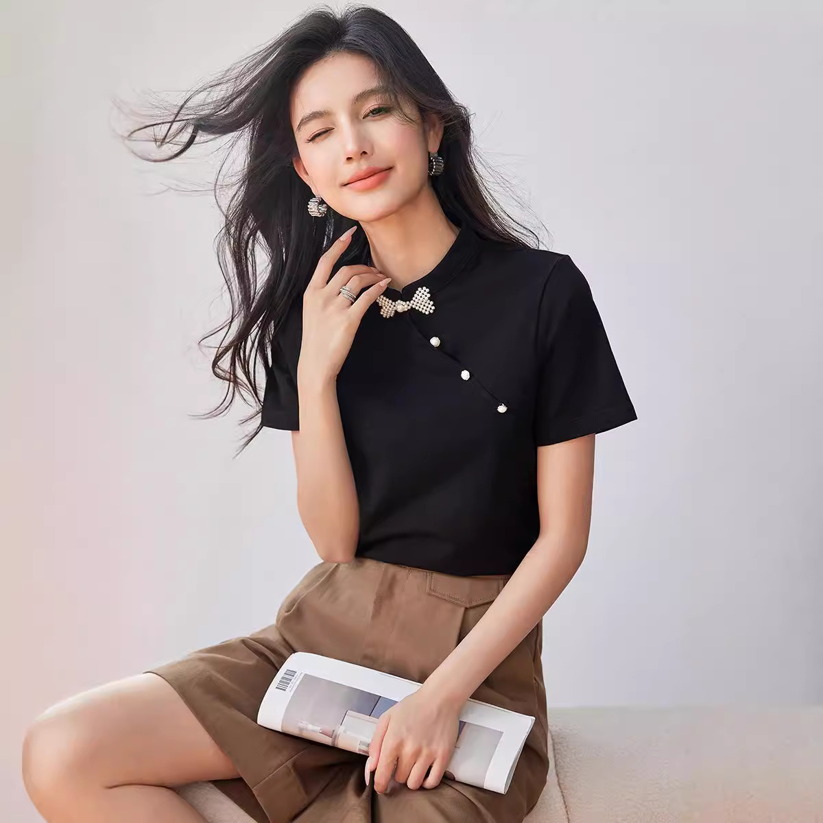 새로운 중국식 진주 버클 티셔츠 여성 반팔 2024 여름 새로운 국가 스타일 틈새 우아한 청삼 칼라 탑