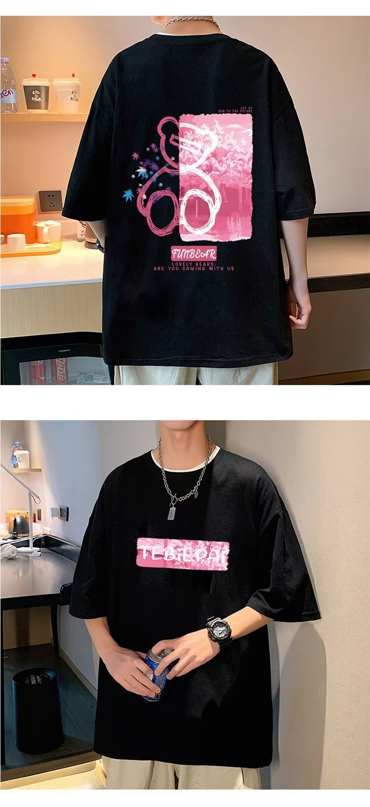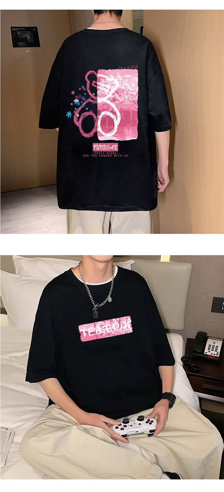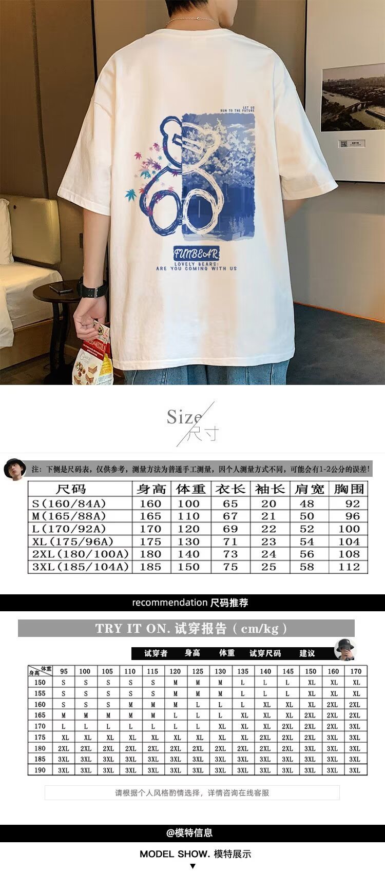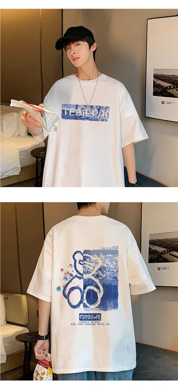 반팔 티셔츠 남자 여름 홍콩 스타일 Ins 트렌디 브랜드 올매치 느슨한 플러스 사이즈 베어 프린트 반팔 티셔츠 탑스토어 가기
