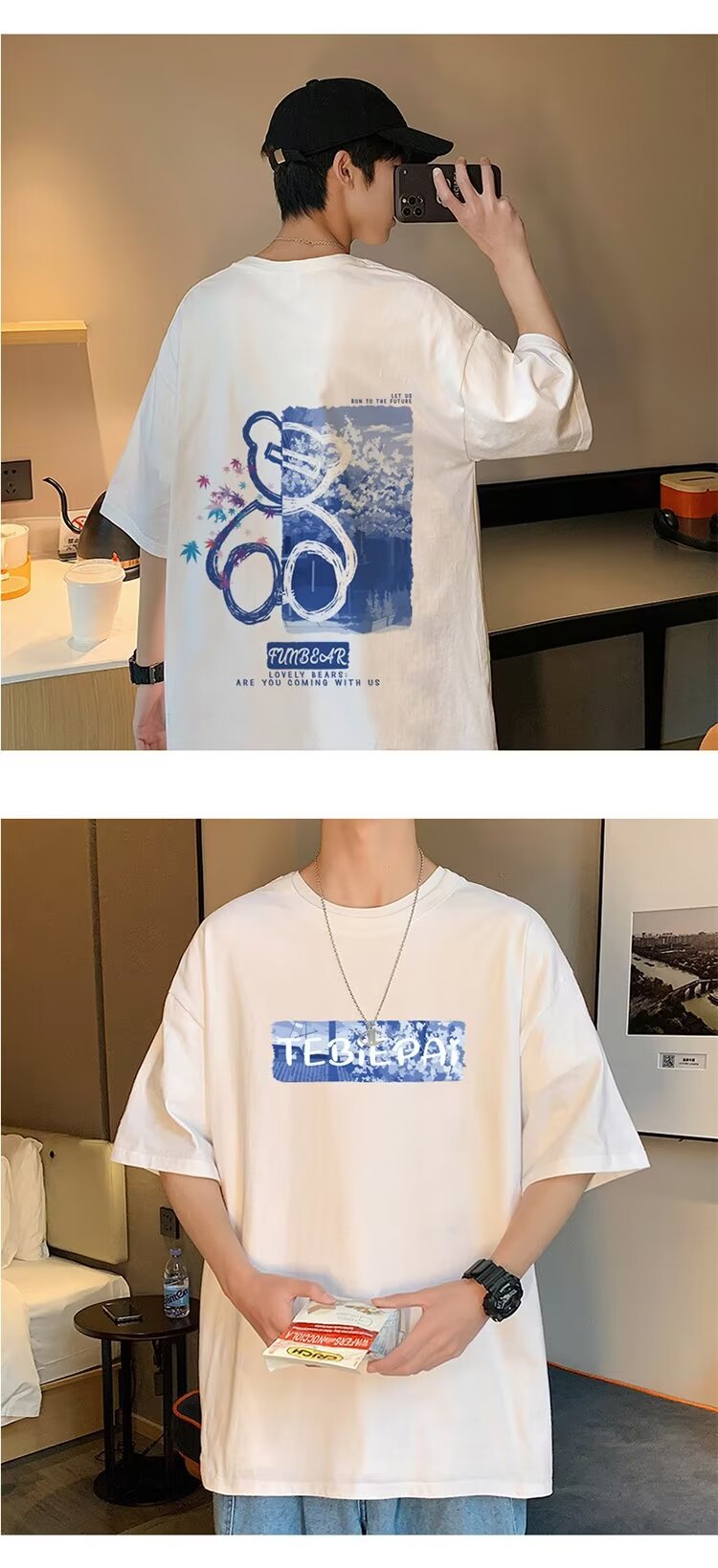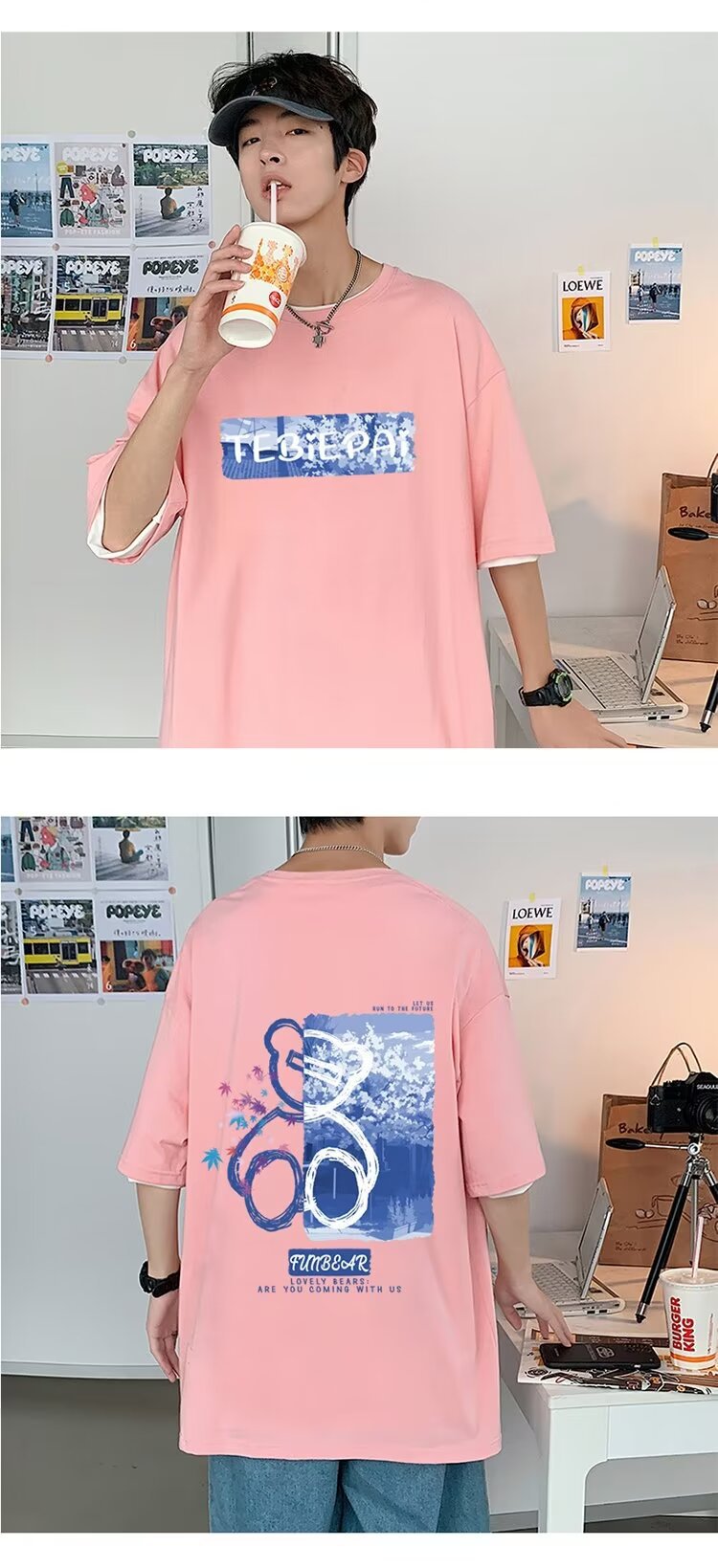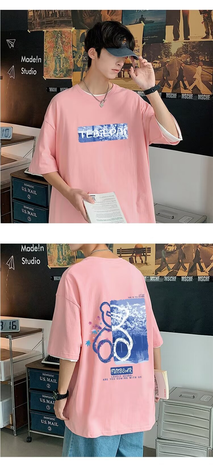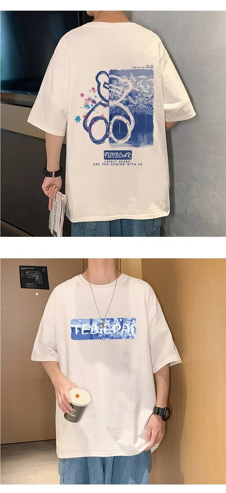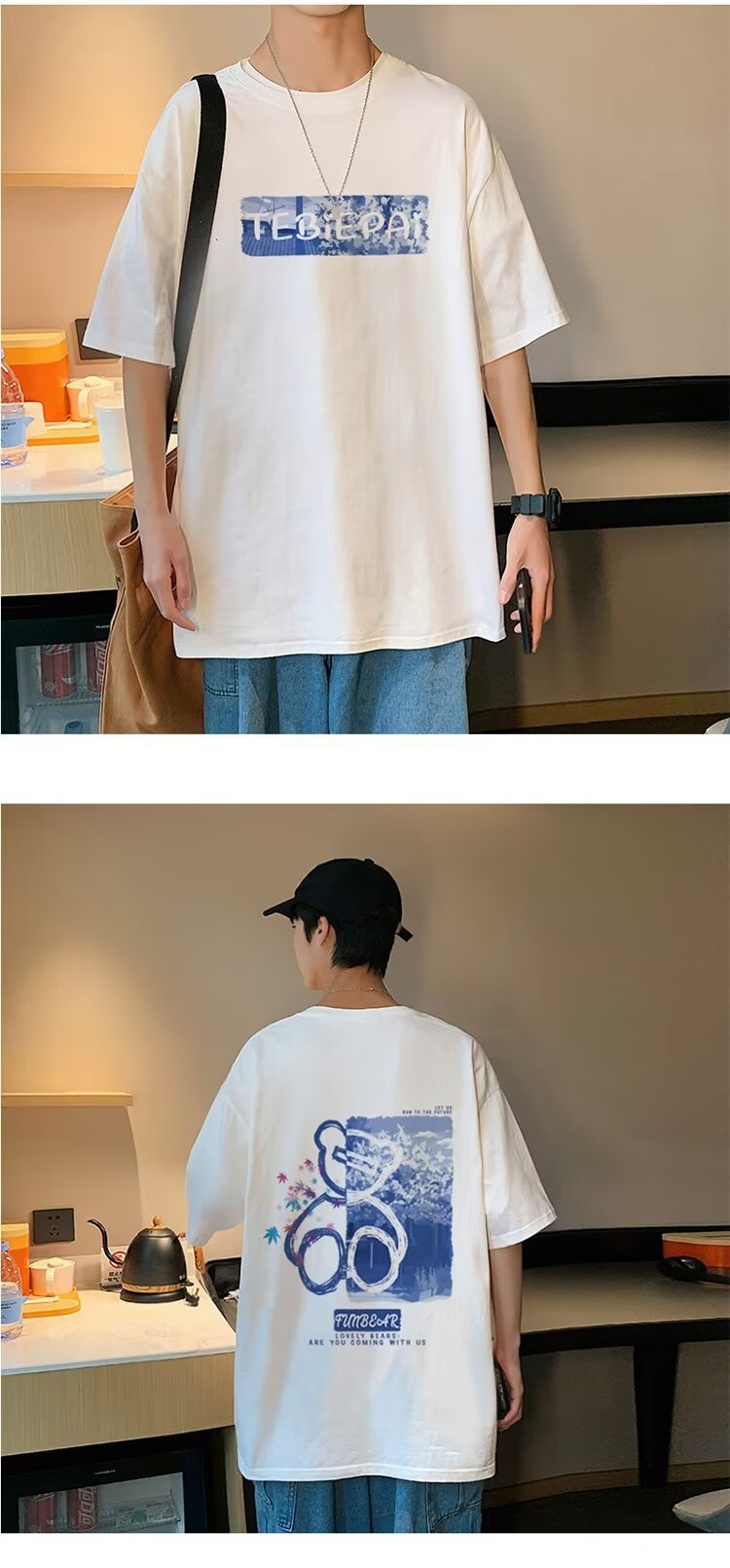 반팔 티셔츠 남자 여름 홍콩 스타일 Ins 트렌디 브랜드 올매치 느슨한 플러스 사이즈 베어 프린트 반팔 티셔츠 탑스토어 가기